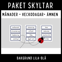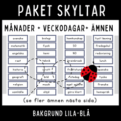 I paketet ingår skyltar för alla månader, alla veckodagar och vanliga skolämnen i en harmonisk blå-lila nyans.