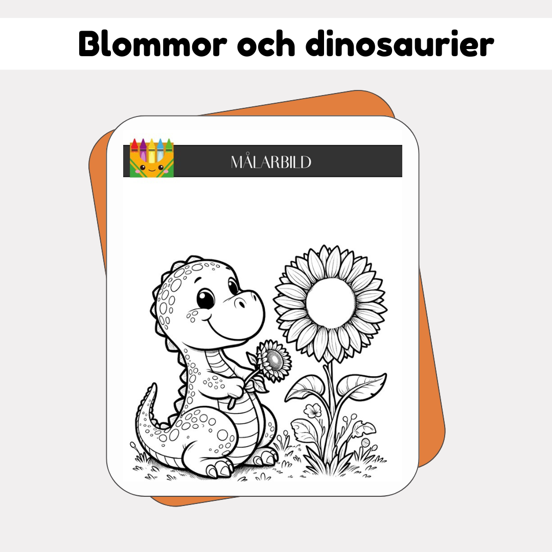 Här finns tio målarbilder på dinosaurier och blommor.