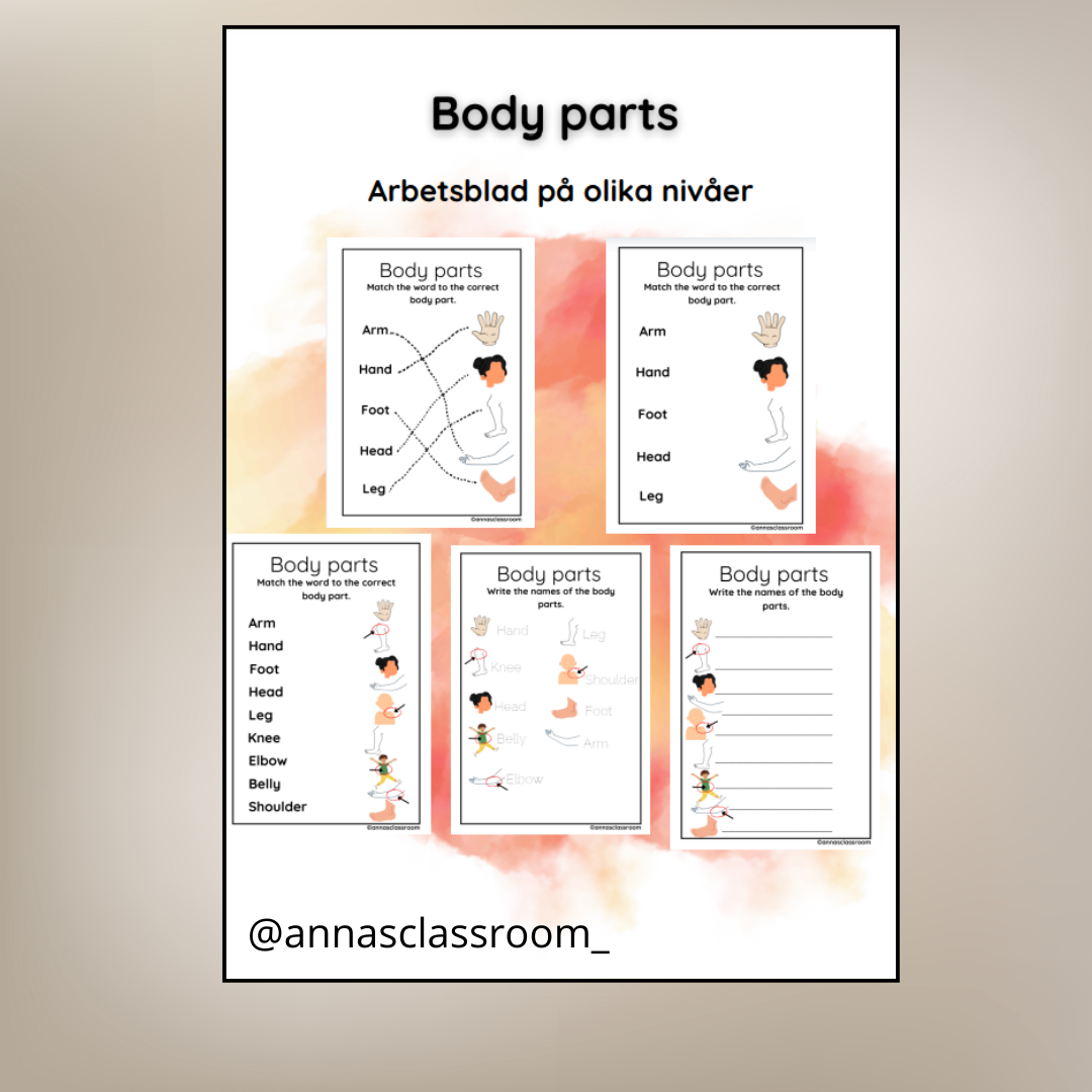 Det här är ett arbetsblad där eleverna får träna på vad olika kroppsdelar heter på engelska. Arbetsbladet finns i 5 olika nivåer för att kunna passa så många olika kunskapsnivåer som möjligt. På lägre nivå handlar det om att dra streck, medan de högre nivåerna har fler ord och handlar om att själv skriva orden.