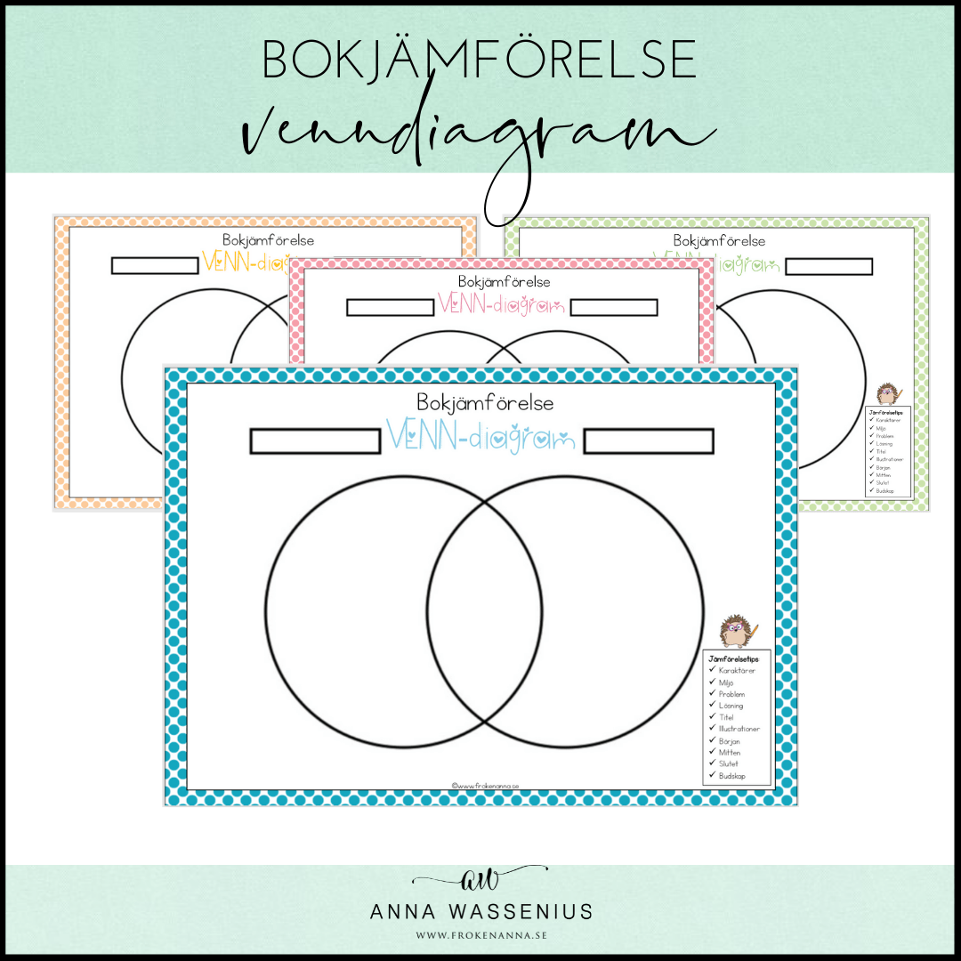 Jämför olika böcker med VENN-diagram, tips på saker att jämföra följer med. VENN-diagrammet har fyra färger. Använd med fördel efter att eleverna haft boksamtal i grupp och jämför böckerna de läst.
