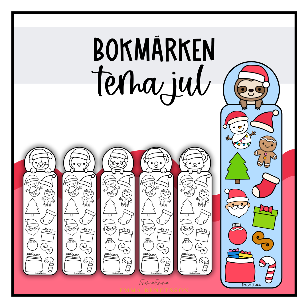 Bokmärken med tema jul. Låt eleverna färglägga ett eget bokmärke. Klipp ut och laminera.