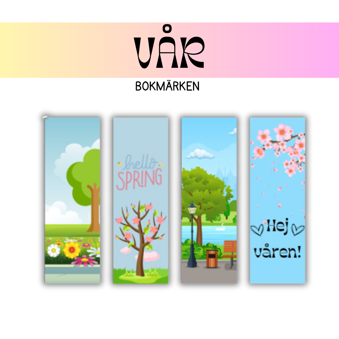 Bokmärken med fyra olika vårmotiv. Laminera för bättre hållbarhet.