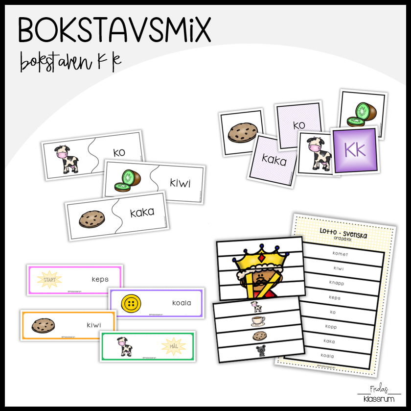 Materialpaket för att träna på bokstaven Kk genom spel.
