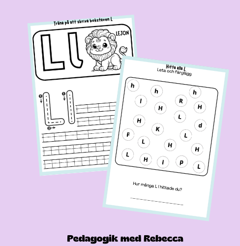 I detta material medföljer en sida där barnet kan träna på att skriva L och enkelt ord som LAMA . De får också leta efter bokstaven L samt färglägga målarbild och bokstaven L.