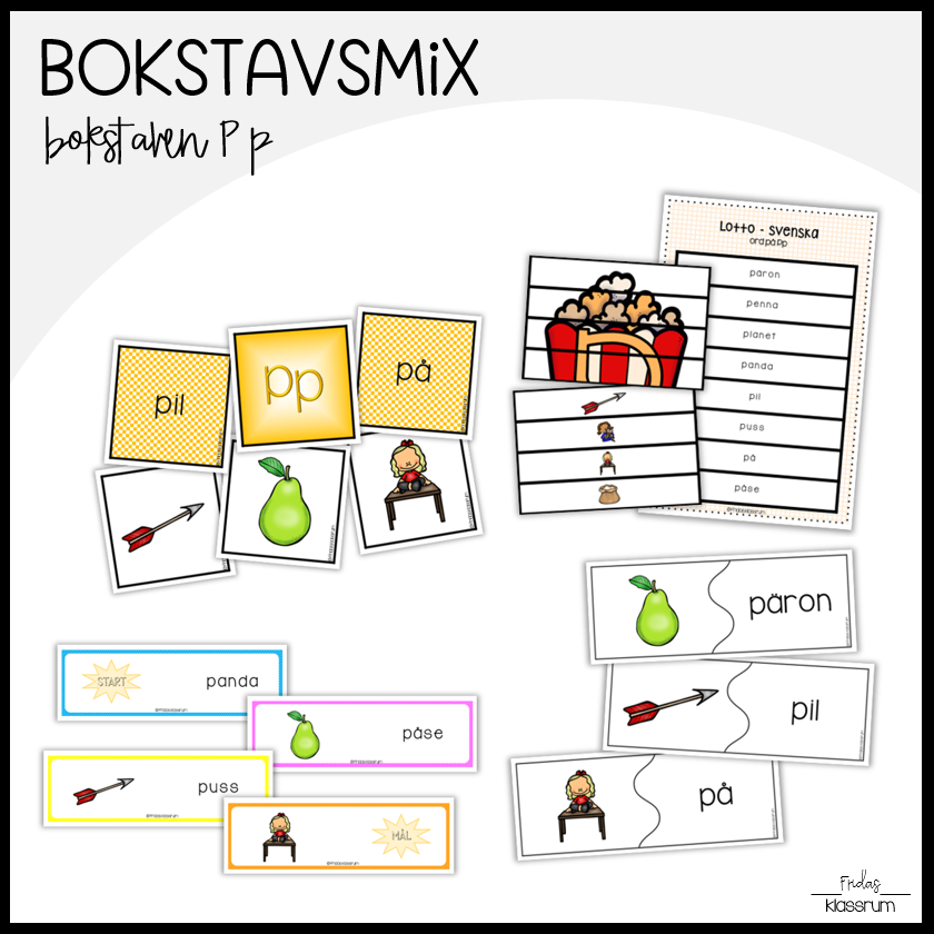 Materialpaket för att träna på bokstaven Pp genom spel.