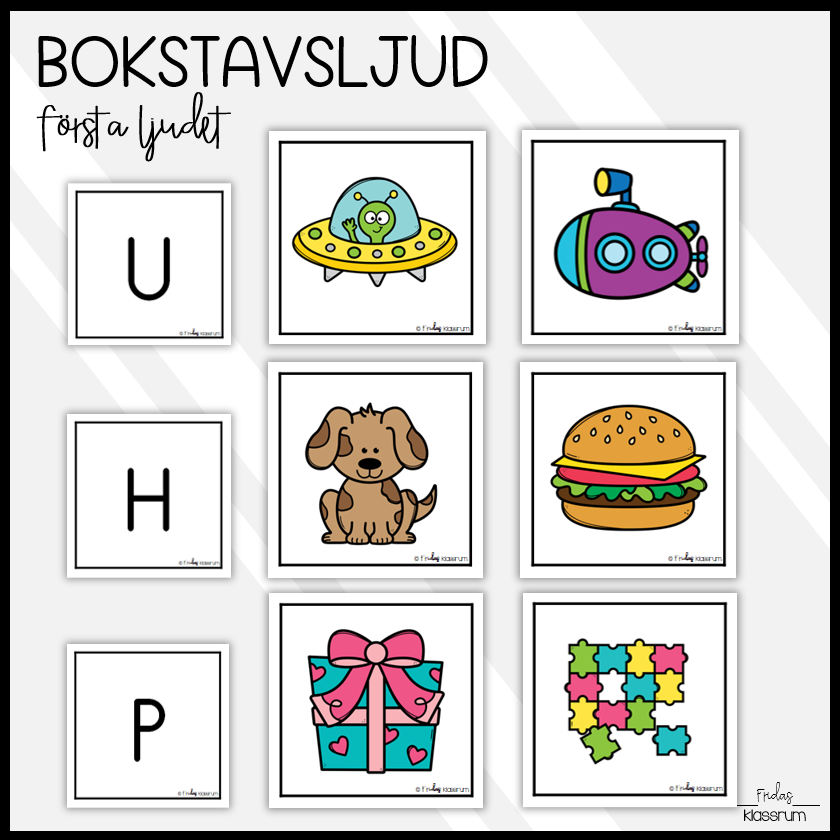 Träna bokstavsljud med fokus på första ljudet med memory. Går att spela genom att para ihop bild och bokstav eller bild och bild.