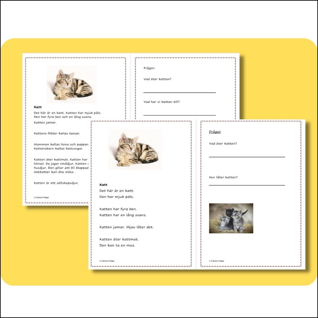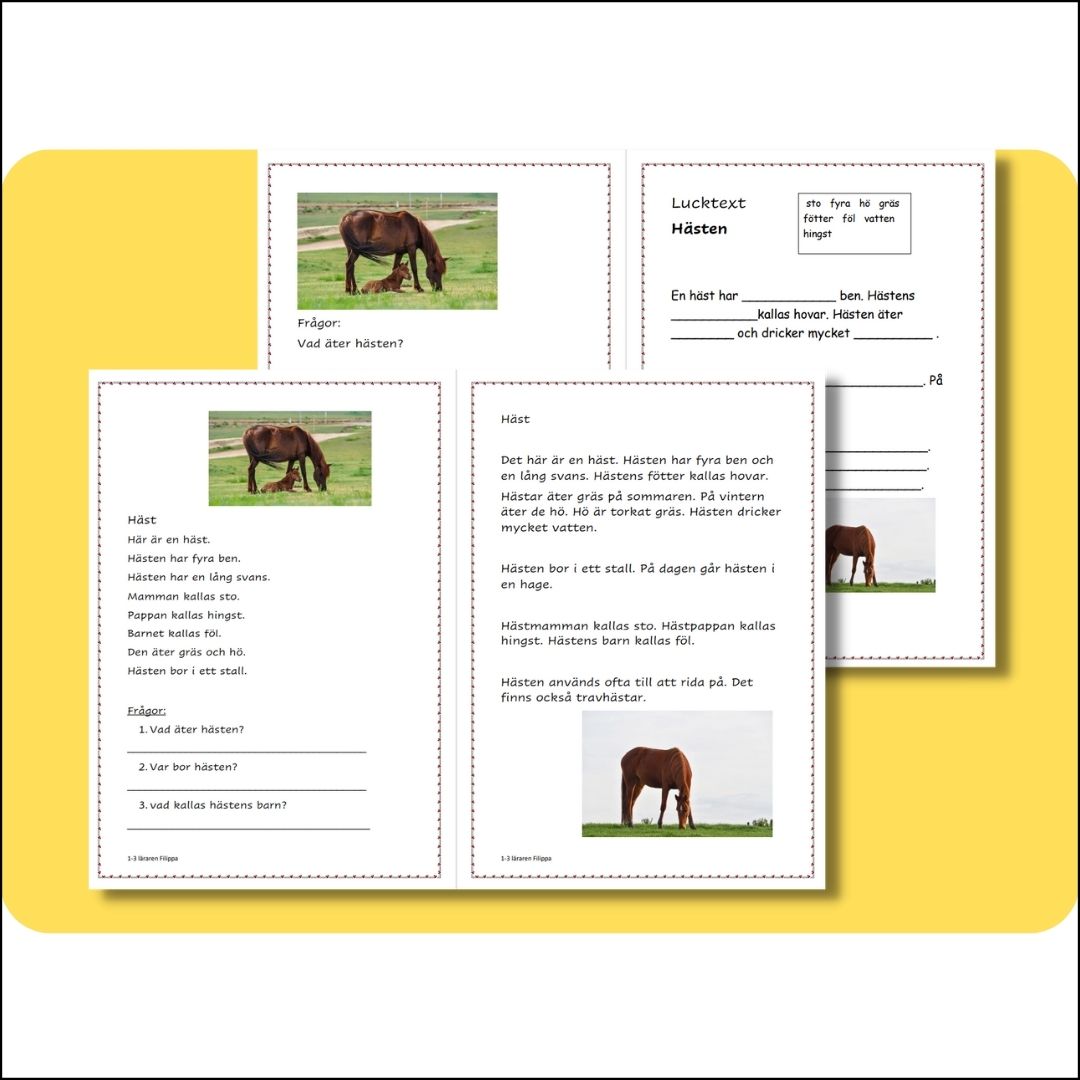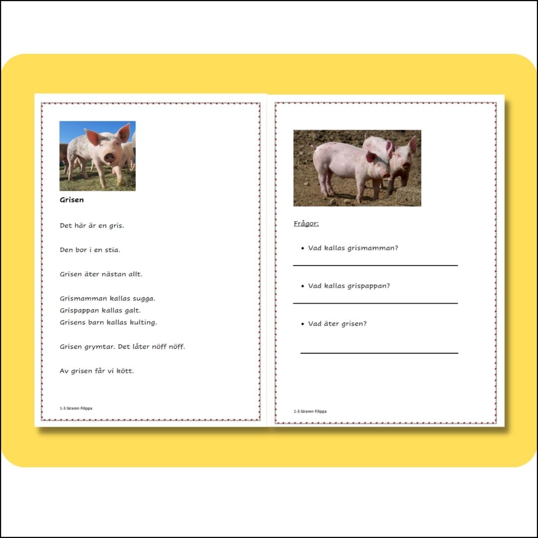 Till varje djur finns två faktatexter med frågor till. En enklare text och en med mer text. Det finns även en lucktext till varje djur.