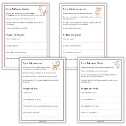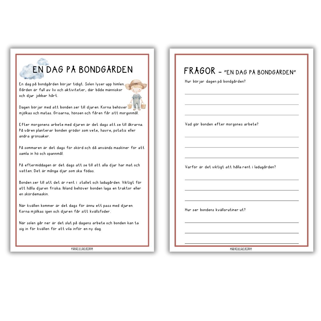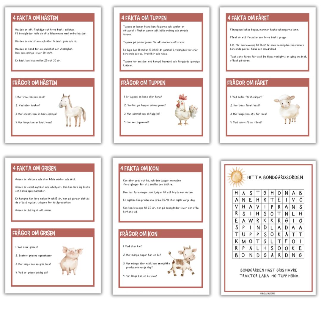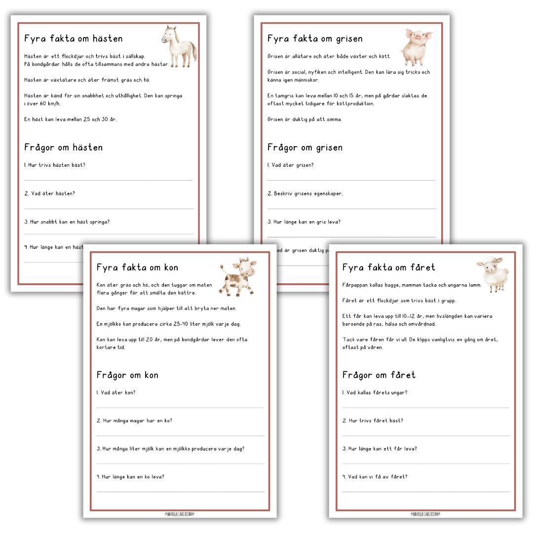 Fem enkla faktatexter om djuren på bondgården med tillhörande frågor.