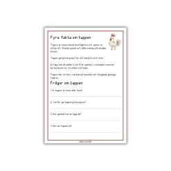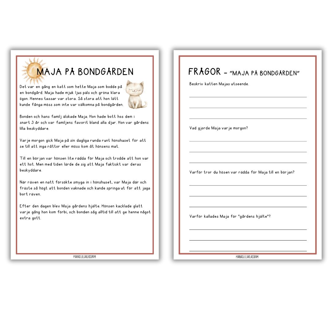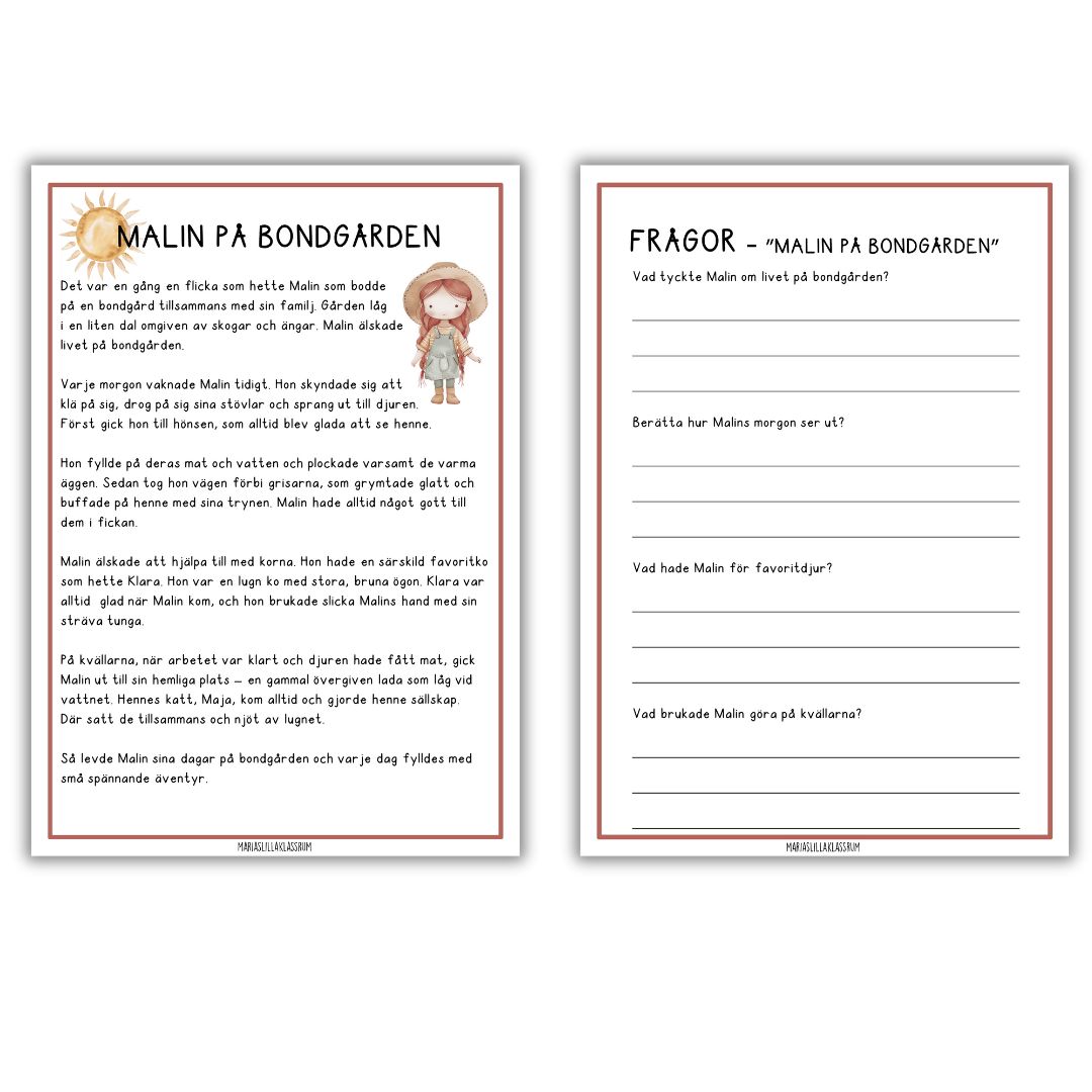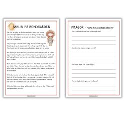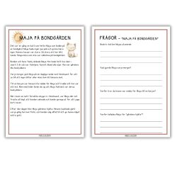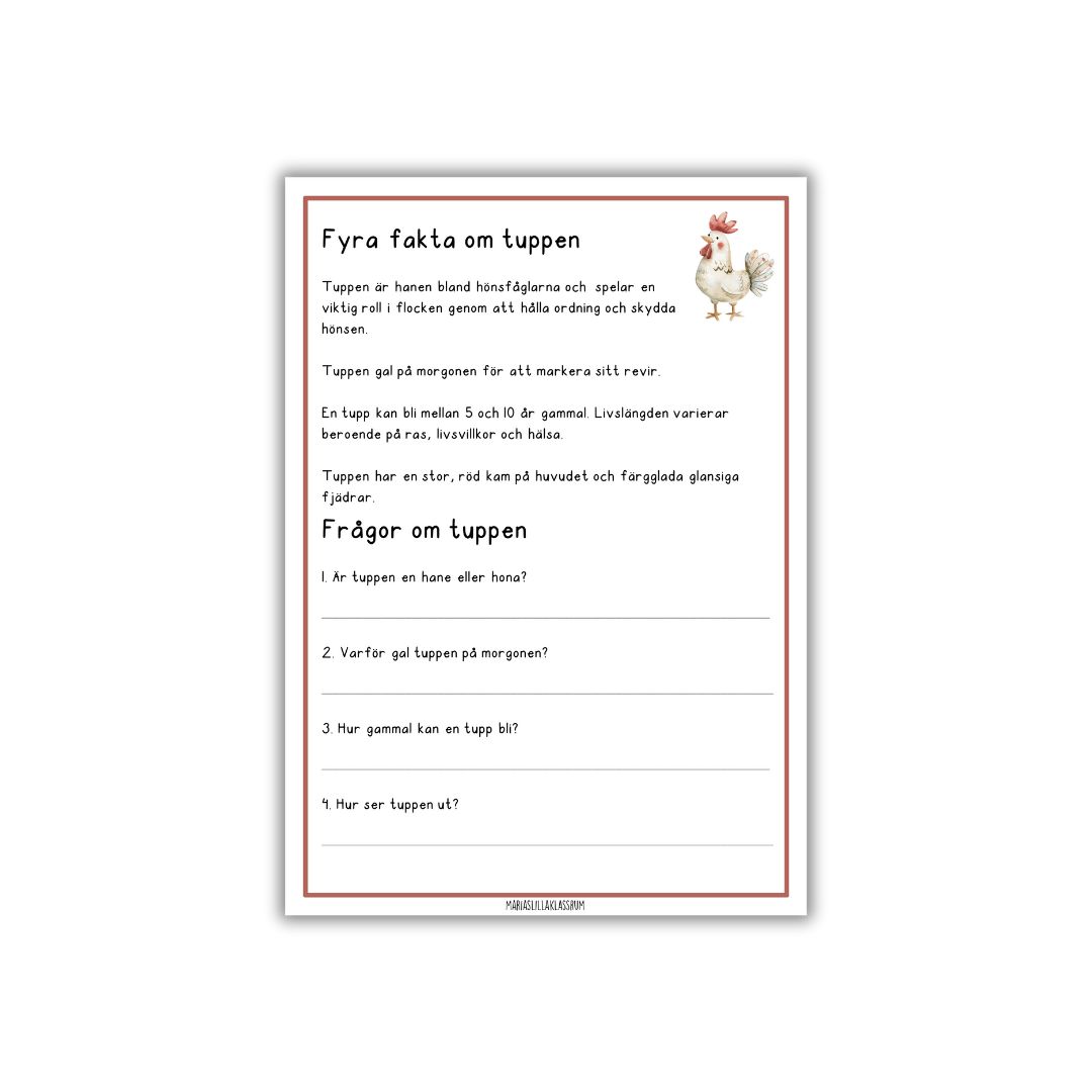 Fem enkla faktatexter om djuren på bondgården med tillhörande frågor.