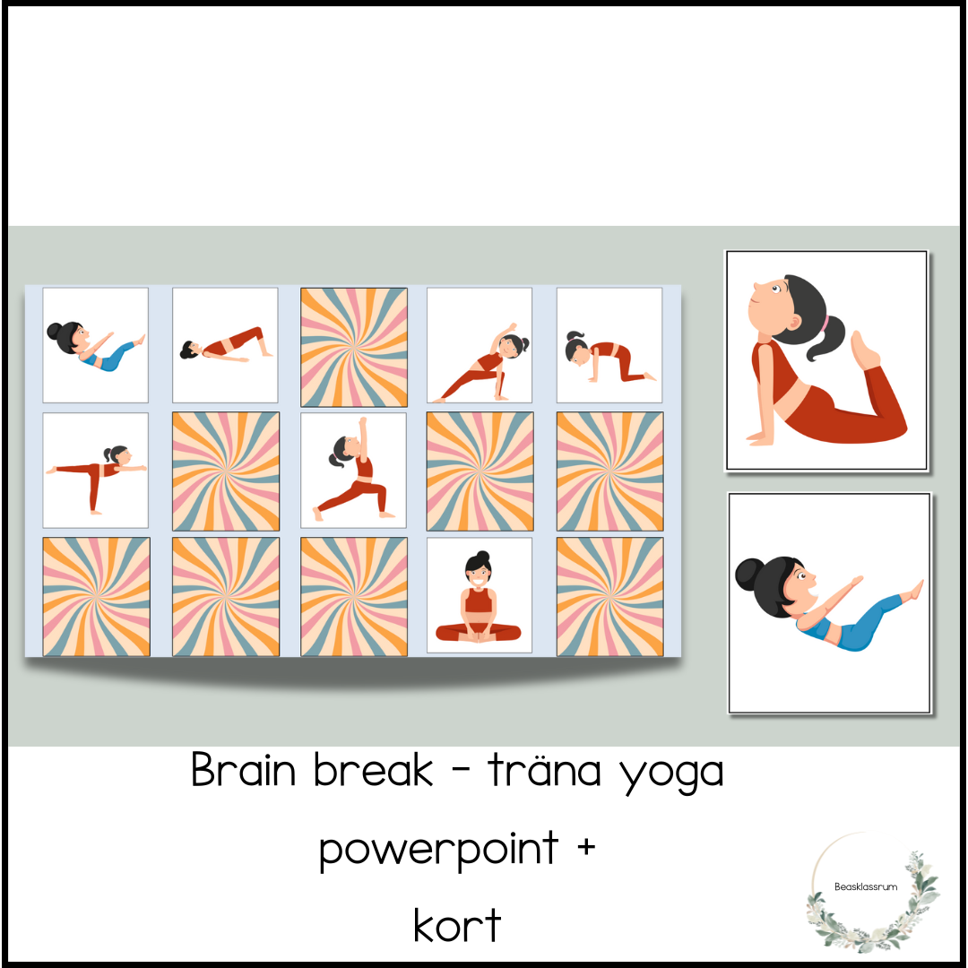1 powerpoint-presentation med 15 yogaställningar. Klicka på ett kort så visar sig en yogaställning som klassen ska göra.