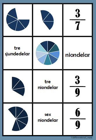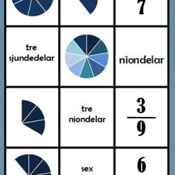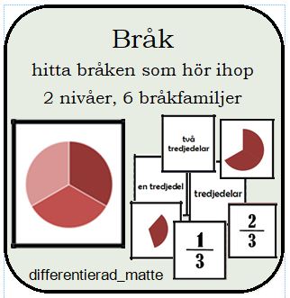 Till en grupp, dvs samma bråk, finns bråktal, skrivna bråknamn och bråkbilder. Gruppen tredjedelar innehåller bild på 3/3, 1/3 och 2/3 och namnen tredjedelar, en tredjedel och två tredjedelar samt bråktalen 1/3 och 2/3.