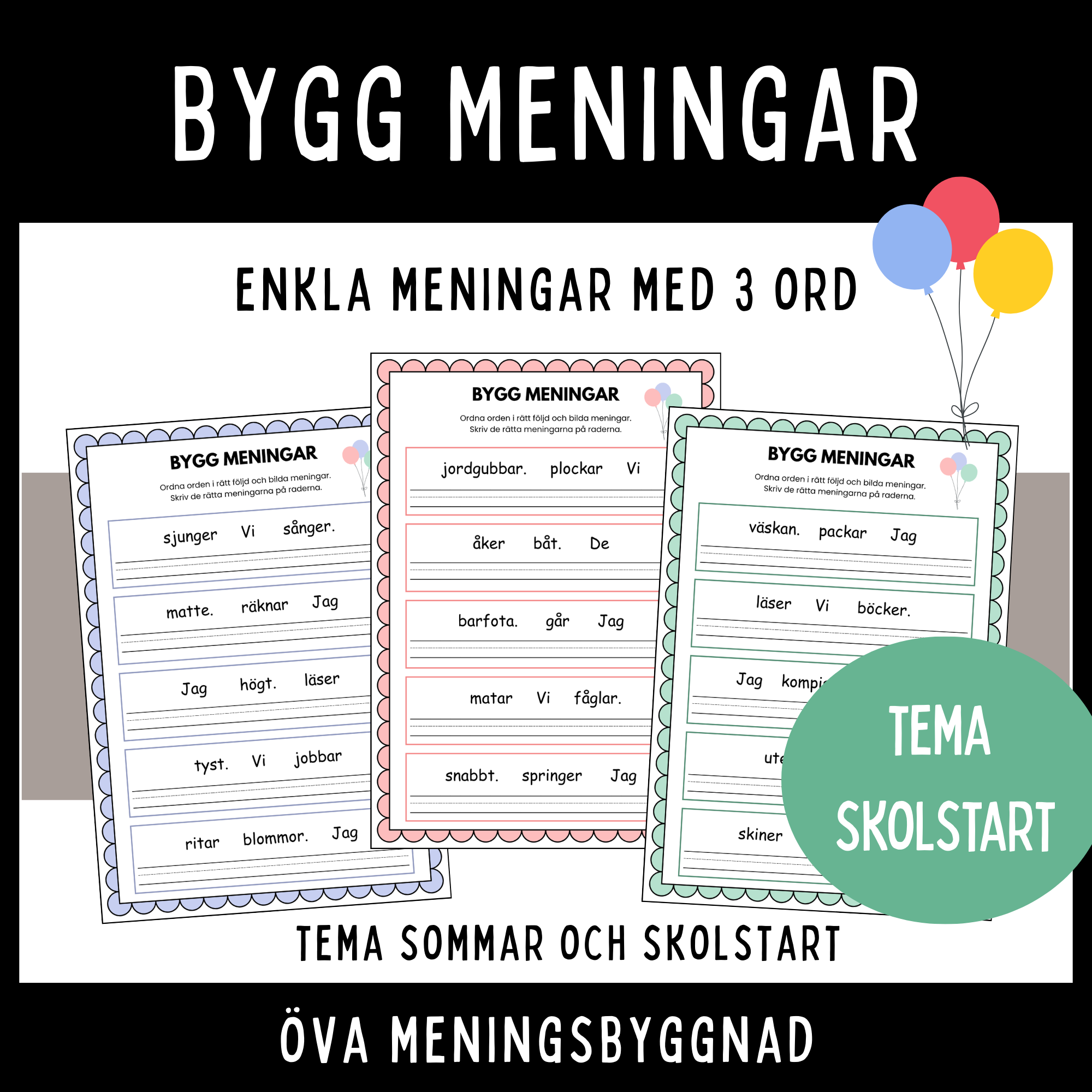 Bygg enkla meningar med 3 ord, tema skolstart och sommar