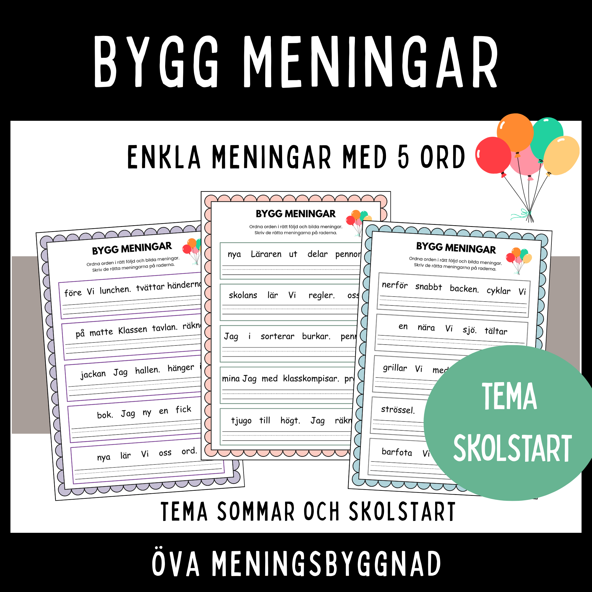 Bygg enkla meningar med 5 ord, tema skolstart och sommar