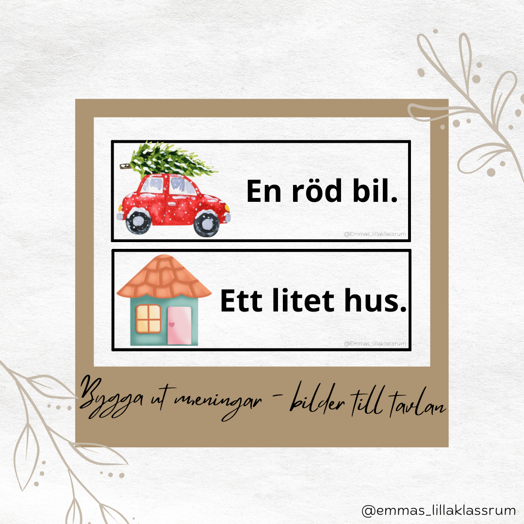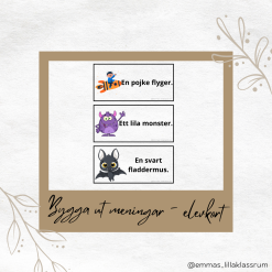 Materialet består av kort (två varianter) där det på varje kort med en bild samt en kort mening på tre bokstäver. Syftet med korten är att eleverna ska läsa meningen, titta på bilden och utveckla meningen. Korten som är stora är tänkta att användas gemensamt på tavlan, att sätta upp ett kort och tillsammans prata om hur man kan utveckla meningen. De lite mindre korten är tänkta att dela ut till eleverna som de självständigt kan arbeta med, eller varför inte i grupp?