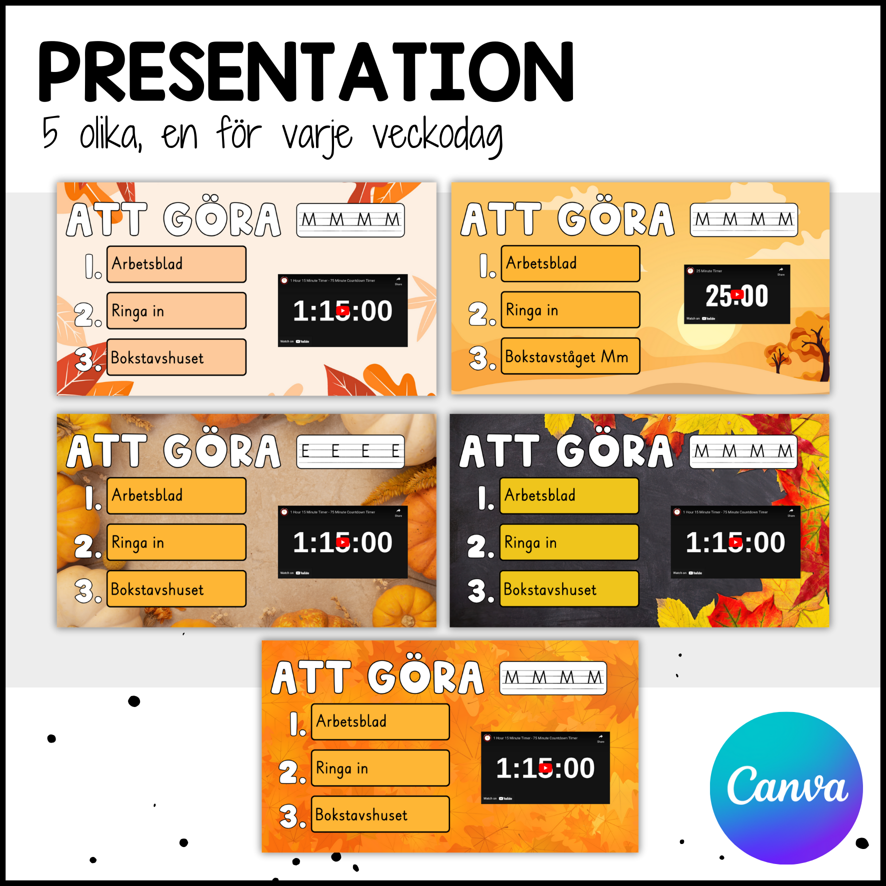 Presentationer/arbetsgång att använda i Canva. Fem olika bakgrunder med hösttema, en för varje veckodag.