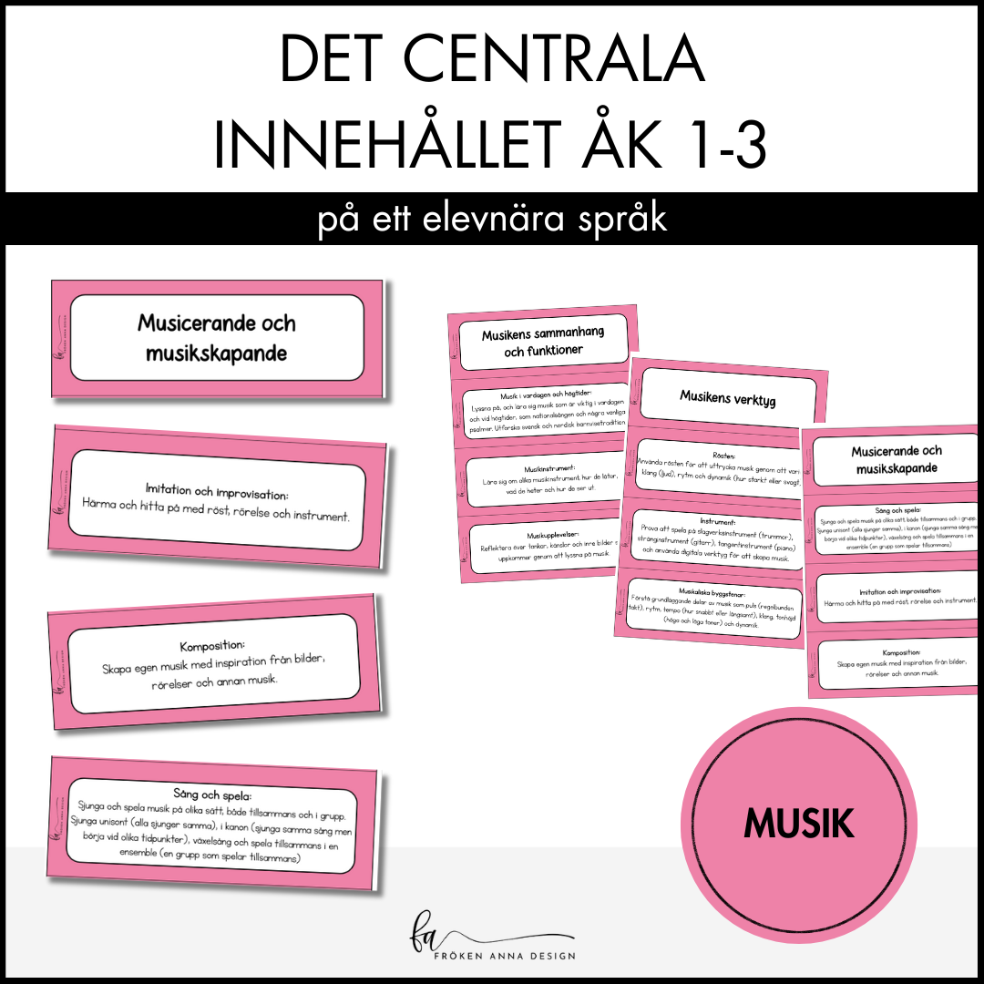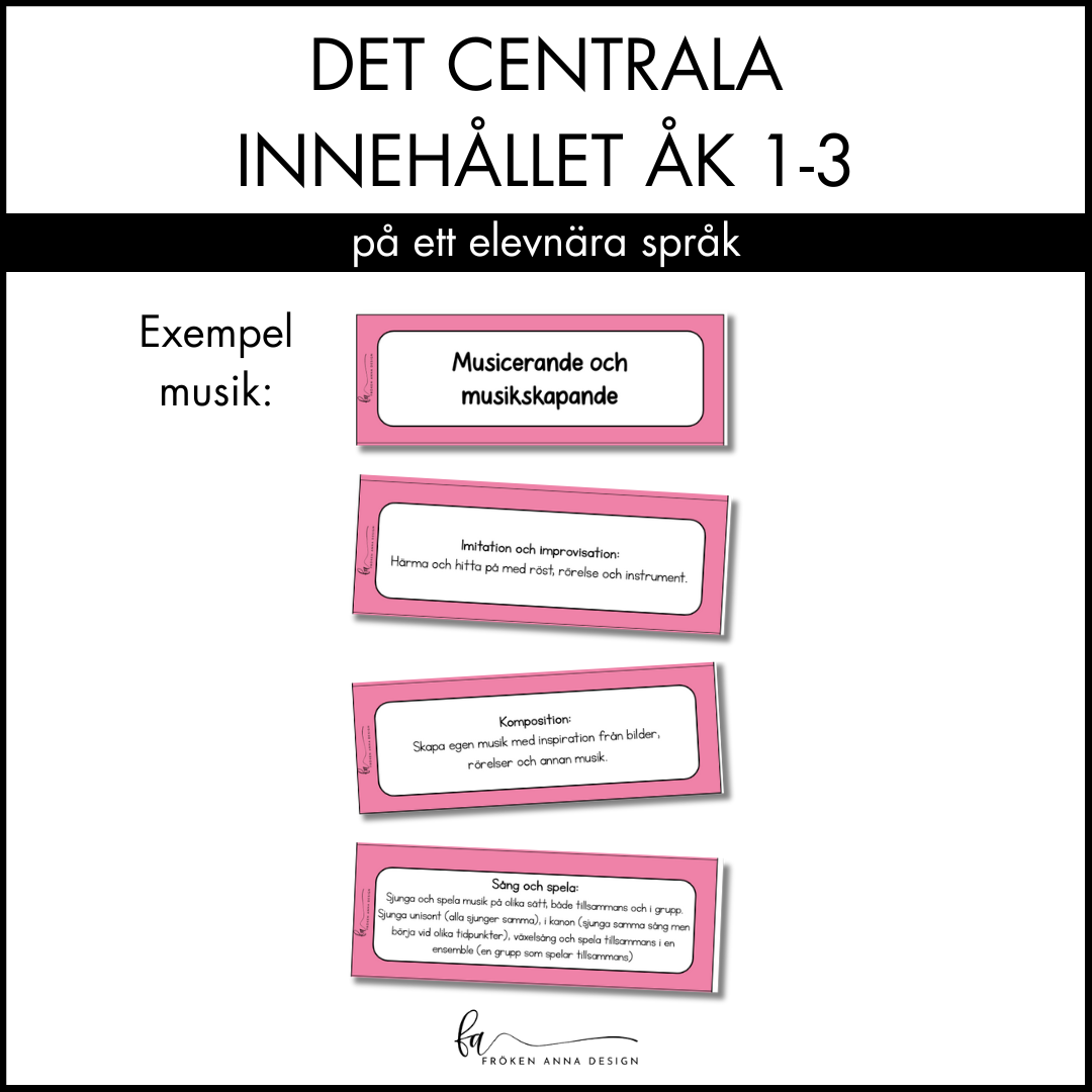 Synliggör det centrala innehållet på ett elevnära språk. I detta paket ingår hela det centrala innehållet för ämnet musik för årskurs 1-3. Varje delmoment finns på ett eget kort, perfekt att sätta upp på tavlan när ni arbetar med de olika områdena. Använd detta material för att tydliggöra och visualisera Lgr22.