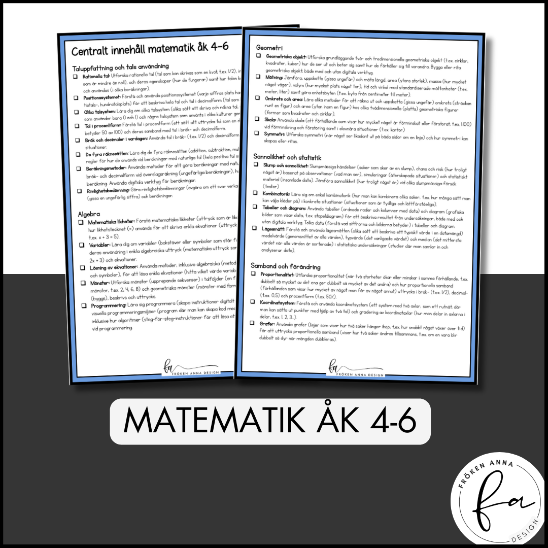 Högtider/Säsong, Skolstart: augusti, Skolstart: januari, Lärarverktyg, Kunskapskrav, Mallar, Planering, Matematik, Algebra, Aritmetik, Bråktal, De fyra räknesätten, Decimaltal, Geometri, Geometriska objekt, Grafer, Jämförelser & Uppskattningar, Kartläggning, Klockan, Lägesord, Mäta, Metoder för beräkningar, Positionssystemet, Problemlösning, Programmering, Samband och förändringar, Sannolikhet och statistik, Statistik, Symmetri, Taluppfattning, Vikt & Volym