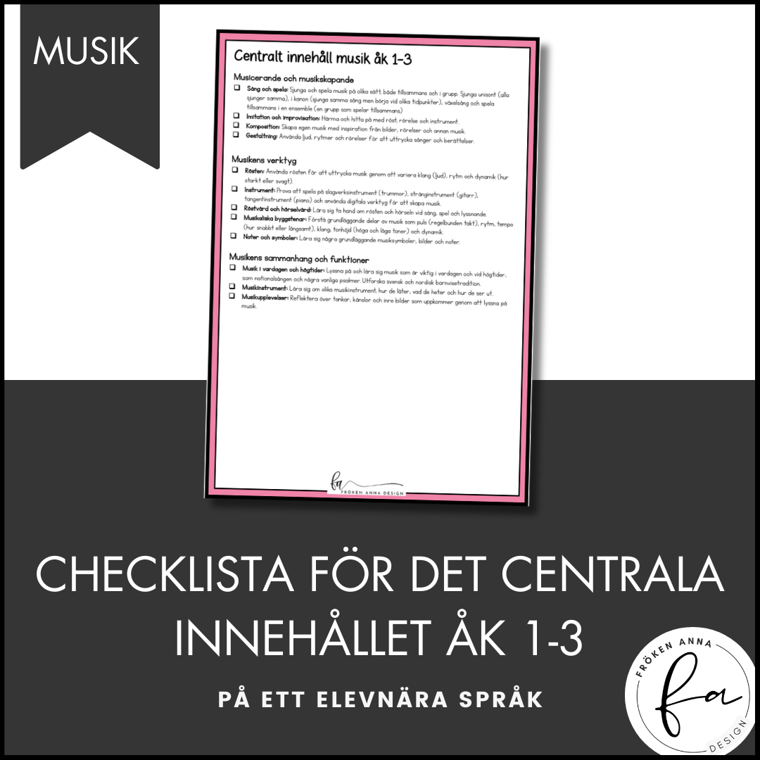 Checklista över det centrala innehållet i ämnet musik för åk 1-3, skrivet på ett elevnära och förenklat språk. Använd som underlag för varje elev vid IUP-samtal eller vid din egen planering av ämnet så inget missas.