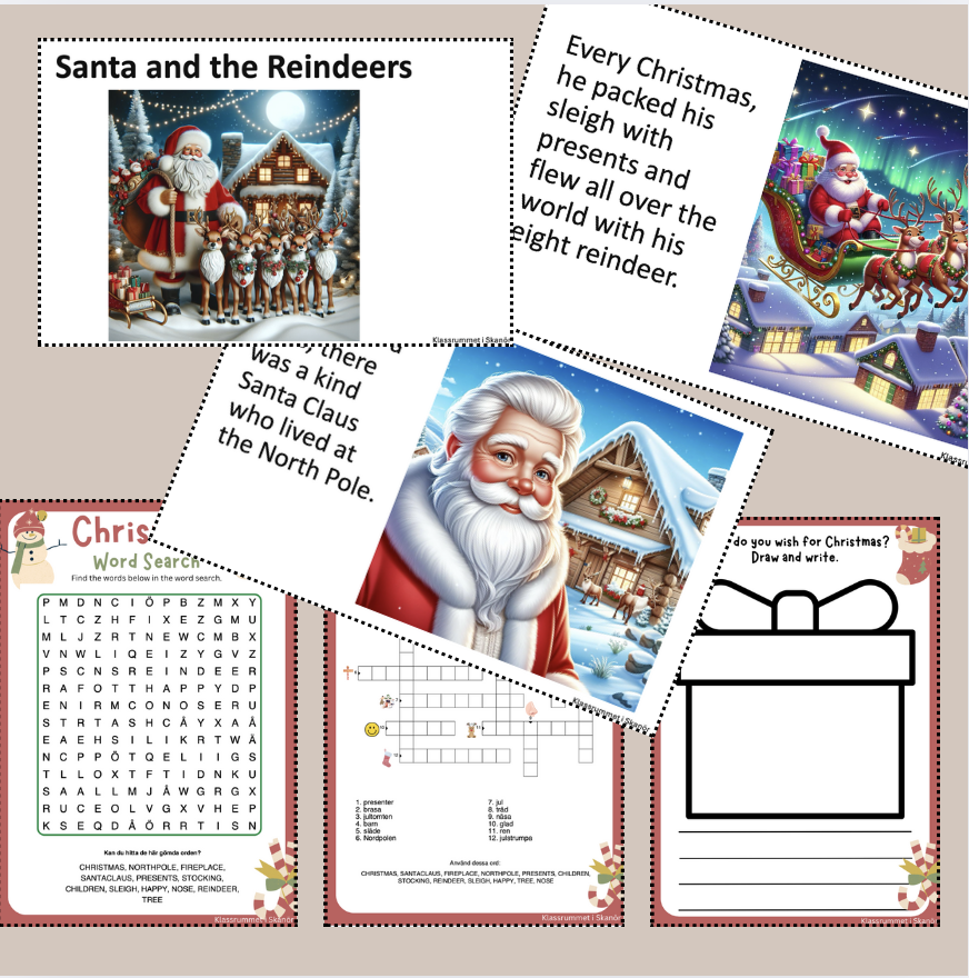 PPT med berättelse på enkel engelska och bilder om Santa Claus. Korsord, ordgömma samt bild att rita och skriva till. ”What do you wish for Christmas? Draw and write.”