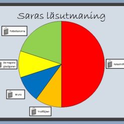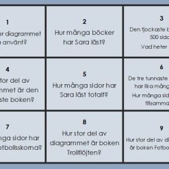 Ett cirkeldiagram över Saras lästa böcker i läsutmaningen. I grupp löser eleverna uppdraget om läsutmaningen med hjälp av frågekorten. De fyller den tomma tabellen. Hjälpdiagram med 10 lika delar används för dem som behöver stöd i de svåraste frågorna. Frågorna stiger i svårighetsgrad. Alla frågor behövs inte för att lösa uppdraget, vilket differentierar övningen.