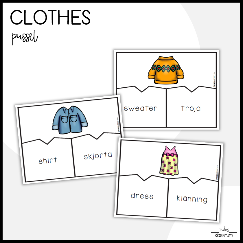 Detta materialet ingår i paketet ”Clothes: Materialpaket”. I materialet ingår även memory, klippdocka och arbetshäfte. Genom att köpa materialpaketet sparar du 10kr.