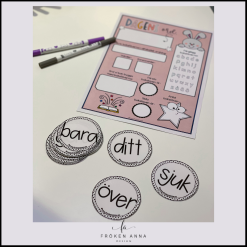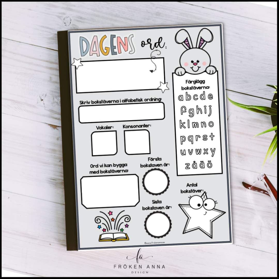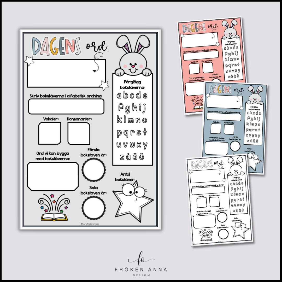 I detta material får eleverna på ett strukturerat sätt träna på alfabetisk ordning, vokaler, konsonanter, begreppen ”först” och ”sist” samt träna antalsuppfattning samtidigt som de arbetar med ”dagens ord”. Komplettera med fördel detta material med materialet ”högfrekventa ord” (Finns ordkort med 2-4 bokstäver)