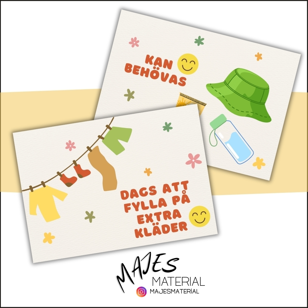 Fem olika kort att sätta upp på barnens hyllor ifall kläder behöver fyllas på. Anpassat till olika årstider samt ett generellt kort för extrakläder.