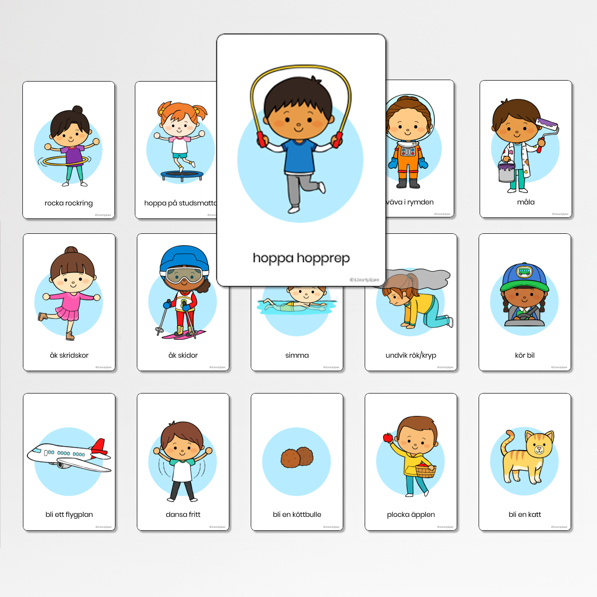 Skriv ut korten i färg och laminera för bättre hållbarhet. Sätt på musik och låt eleverna dansa. När som helst under låten signalerar du att de ska titta på dig samtidigt som du håller upp ett av korten. Eleverna ska då dansa med dansrörelser som kan förknippas med kortet. När som helst kan du byta igen och barnen försöker efterlikna den nya dansrörelsen. Ha en härlig stund med eleverna där de får röra på sig och skratta tillsammans!