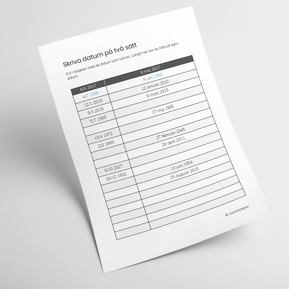 När ni arbetar med att skriva datum på två olika sätt är det här dokumentet perfekt att använda! Du kan med fördel skriva ut dokumentet i färg för att underlätta för eleverna. På raderna längst ner kan eleverna skriva helt egna datum.