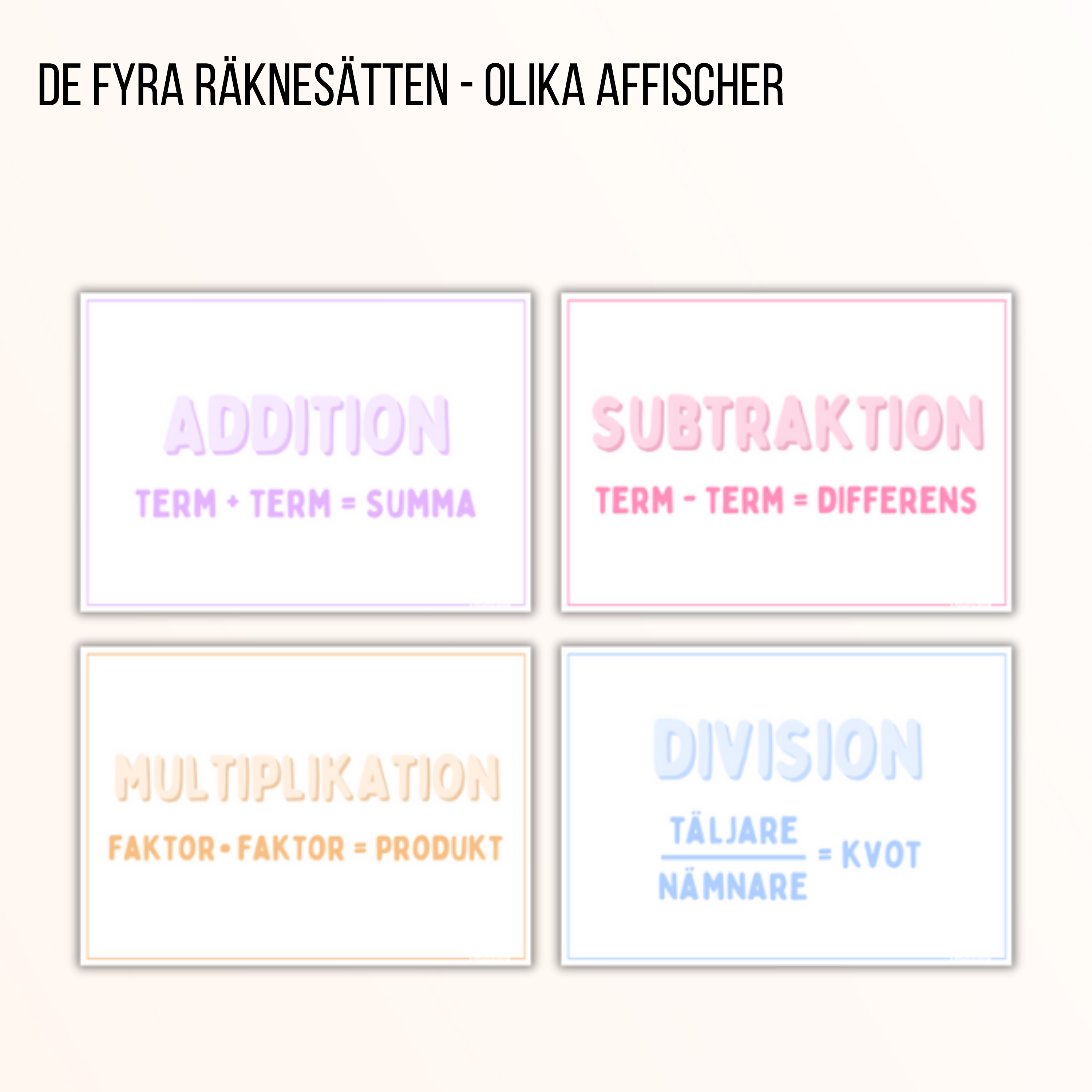 Olika affischer som visar de fyra räknesätten, samt begrepp som är kopplade till dessa.