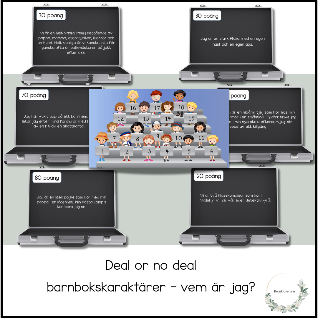 Roligt och engagerande sätt att låta eleverna träna på olika barnbokskaraktärer. Vilka kan de känna igen utifrån en beskrivning?