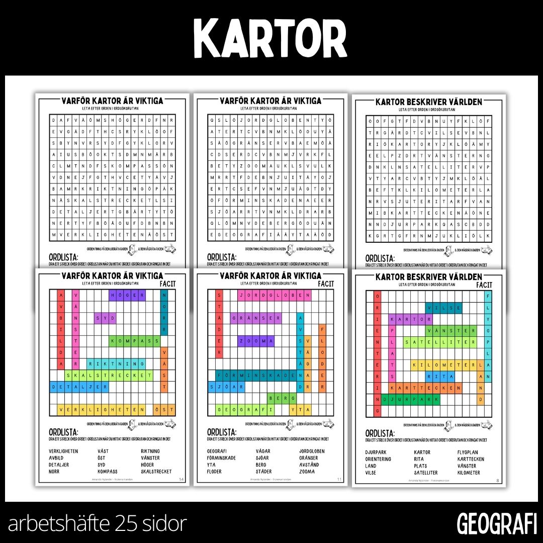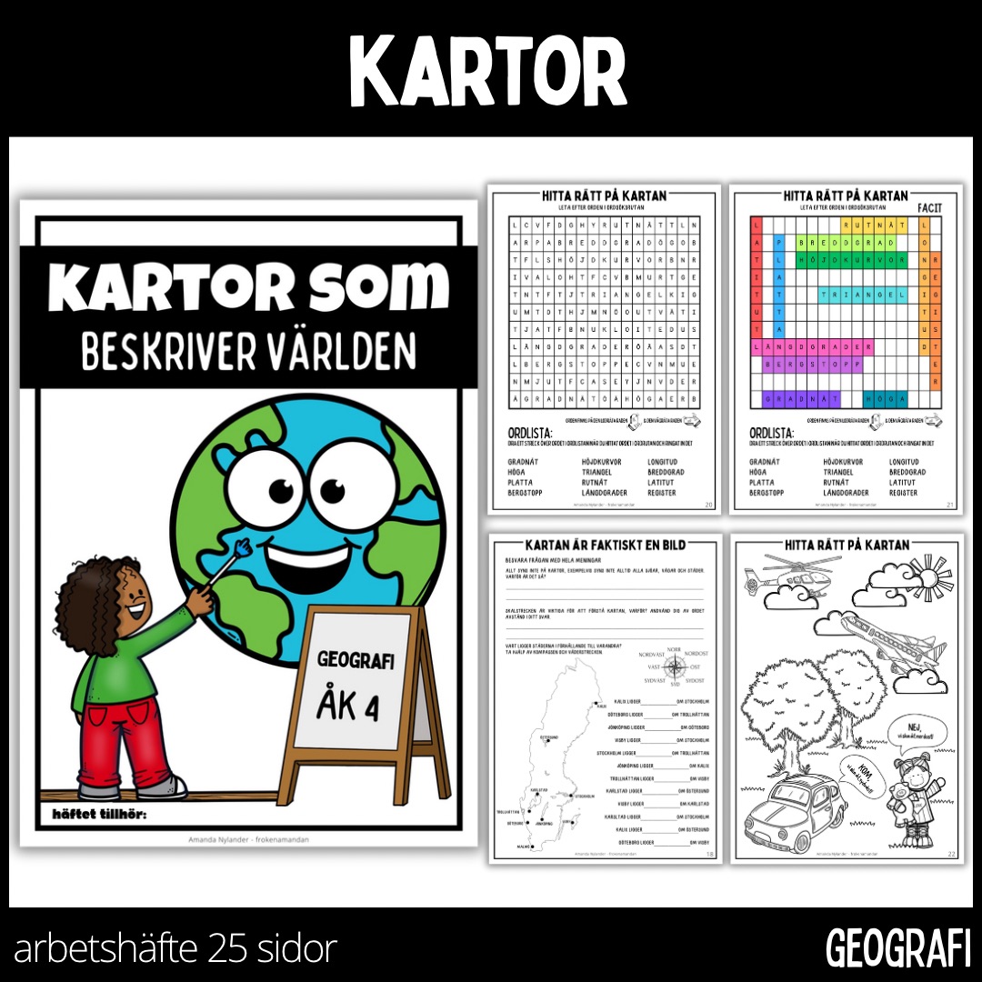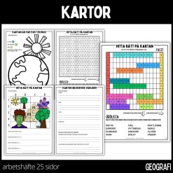Ett arbetshäfte på 26 sidor med temat kartor. När jag gjort materialet har jag utgått från läromedlet PULS SO. Materialet ämnar att utveckla elevernas ordförråd och begreppskunskap samt kunskaper om kartor och allt vad det kan tänkas innebära.