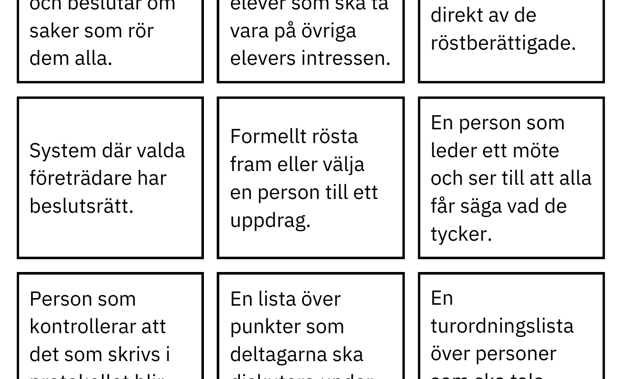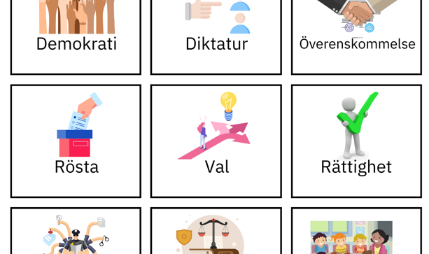Memory/para ihop rätt bild med rätt beskrivning för att repetera ord och beskrivningar. Bra att använda som en uppvärmning när man arbetar med demokrati eller att spela när man har arbetat klart. Eleverna kan börja med att para ihop rätt bild med rätt beskrivning och därefter spela memory.