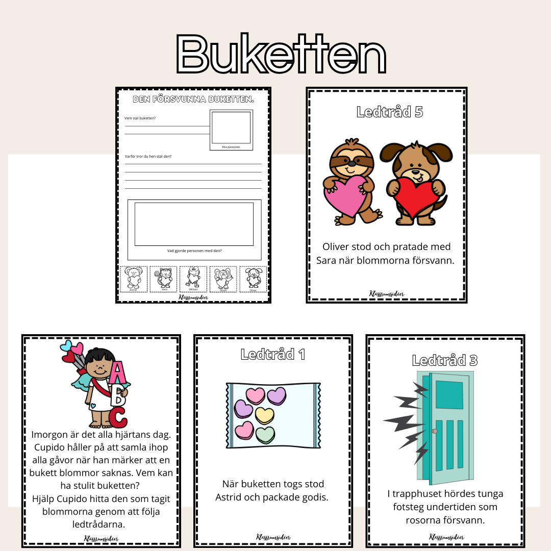 Två fall som handlar om något som har försvunnit. Eleverna kan enskilt eller tillsammans följa ledtrådarna för att komma fram till vem som kan ha stulit föremålet. I denna övning finns inte något givet svar. Utan övningen går ut på att eleverna ska diskutera och resonera med varandra för att komma fram till de olika lösningar.