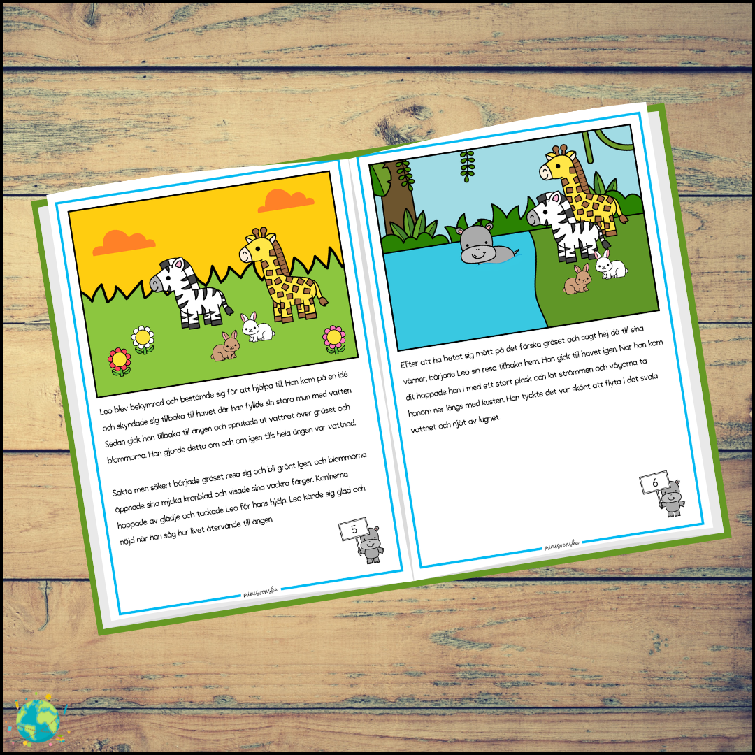 Följ med Leo, den surfande flodhästen, på ett varmt och vänskapligt äventyr som väcker både fantasi och eftertanke. Det här paketet innehåller allt du behöver för ett komplett temaarbete som kopplar samman högläsning, språkutveckling, skrivglädje, återberättande och värdegrund – med ett stänk av miljötänk! 🌍