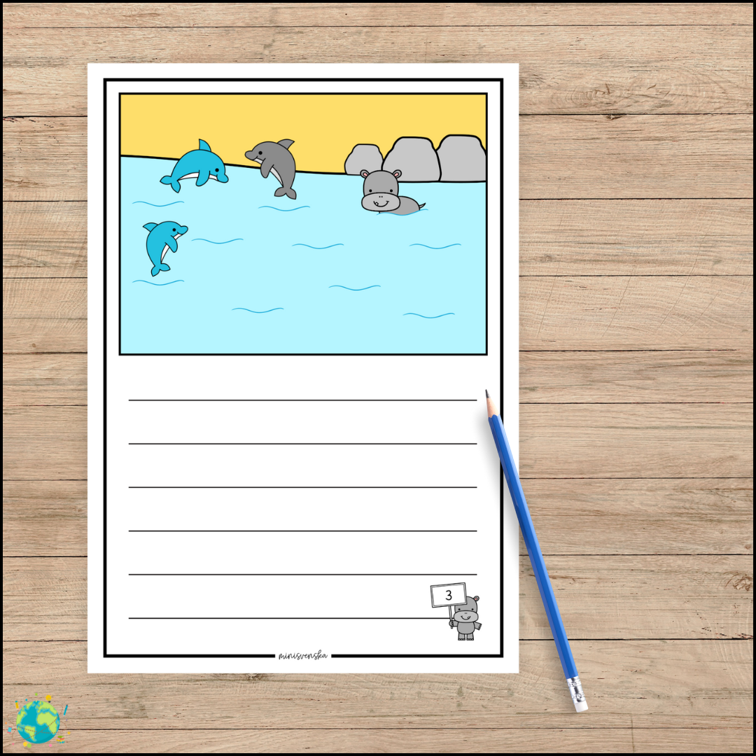 – 8 bildblad med skrivrader där eleverna färglägger och skriver meningar