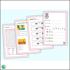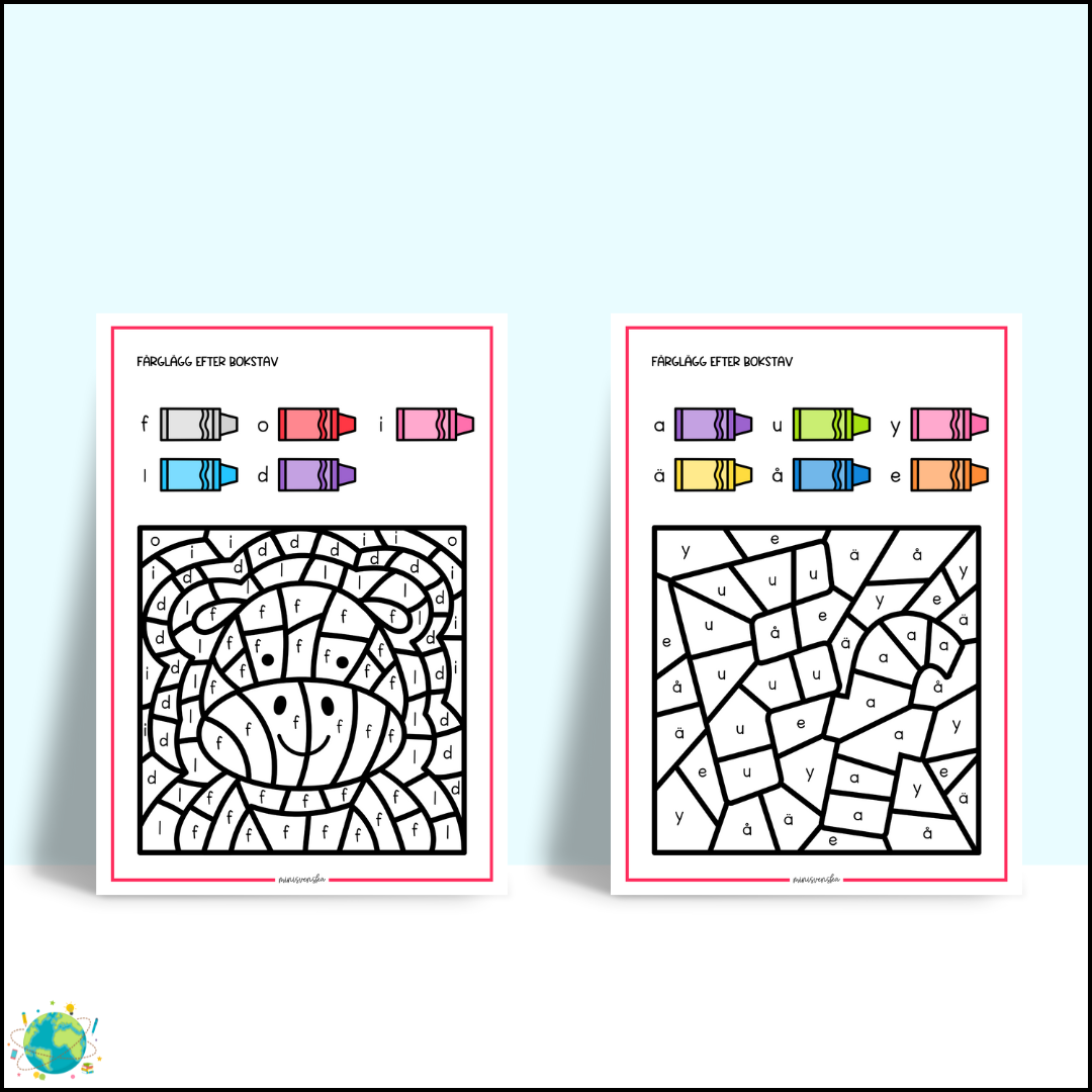 – Läsförståelse, rebusar, ordsök, skrivuppgifter, färgläggning efter bokstav