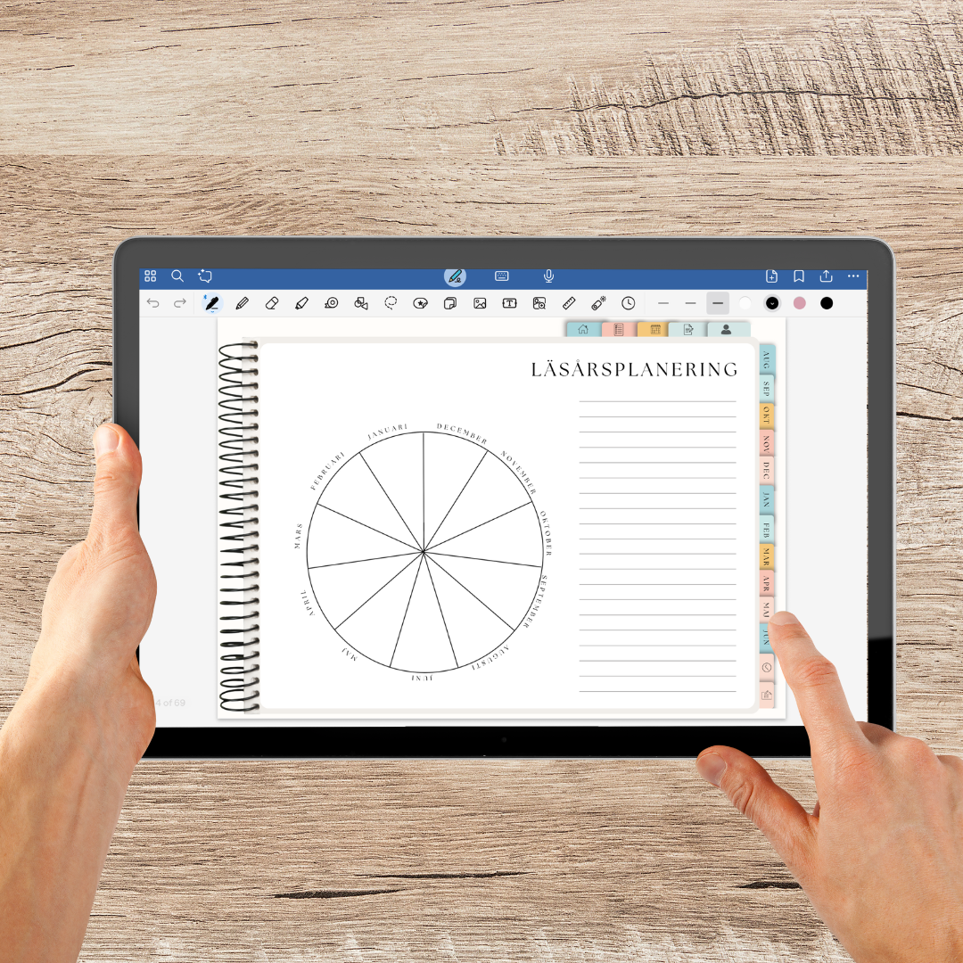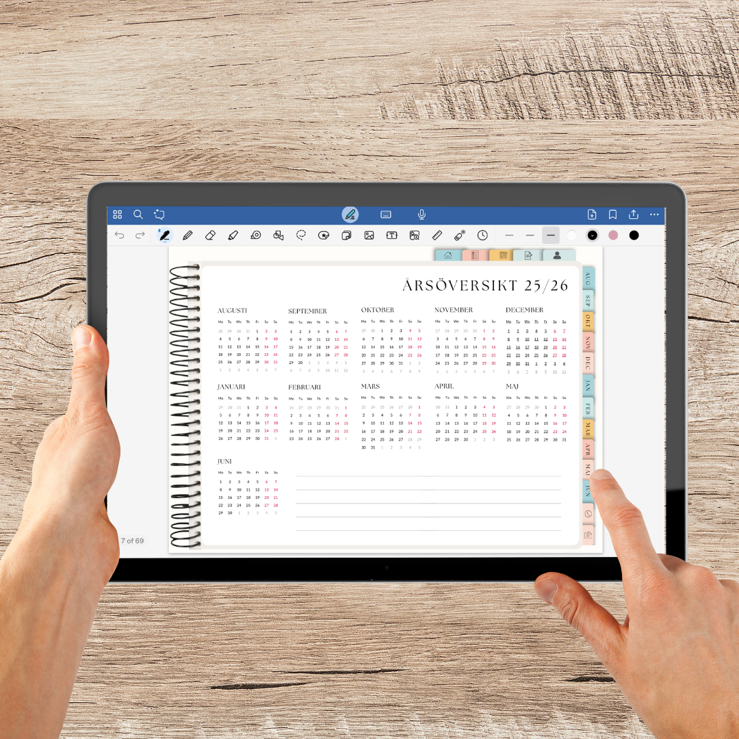 Den här kalendern är interaktiv med klickbara länkar som gör det enkelt att navigera mellan innehållsförteckning, månader, veckor och planeringssidor – utan att behöva bläddra sida för sida. Perfekt att använda i appar som Goodnotes eller Notability på din iPad.