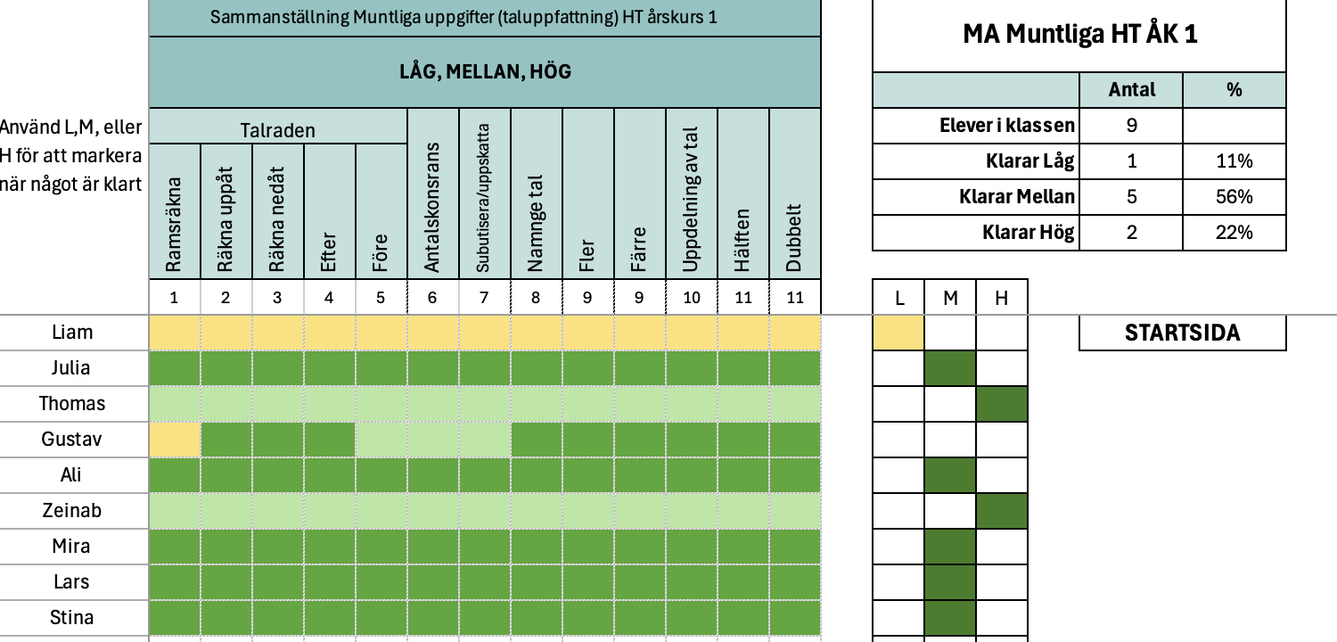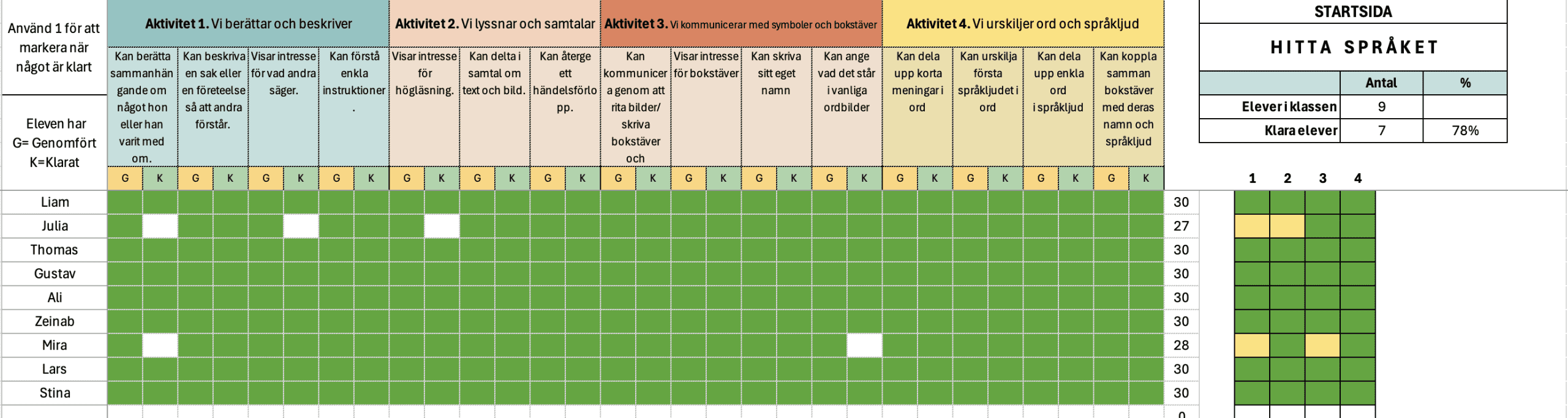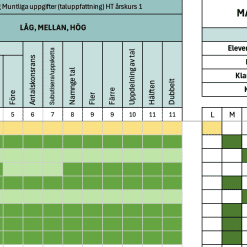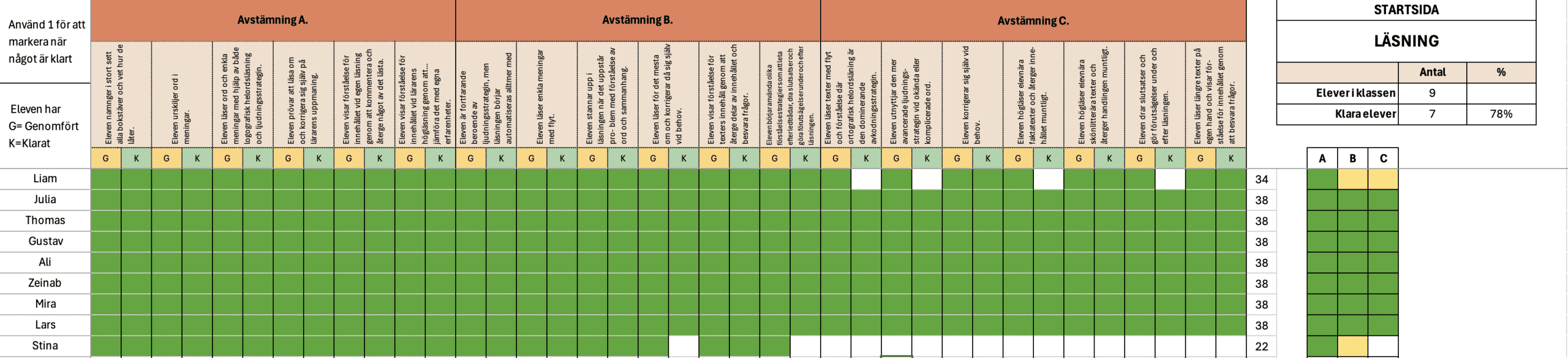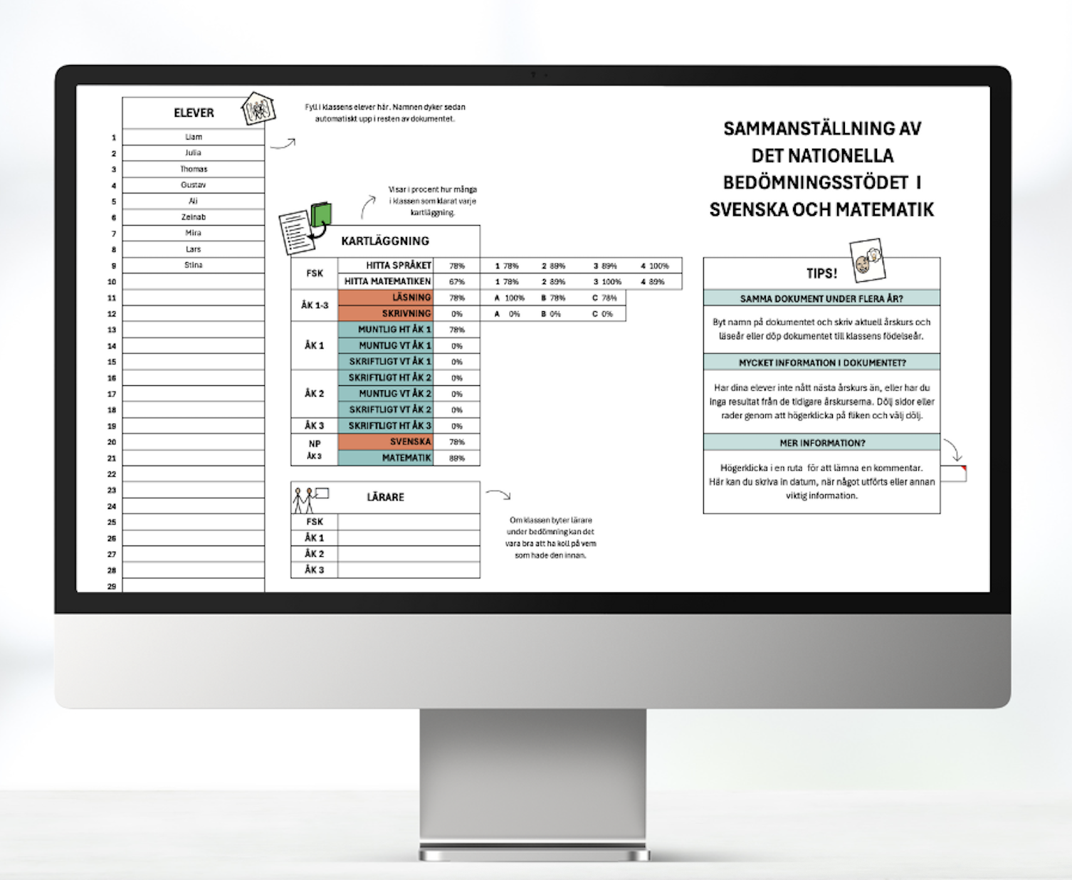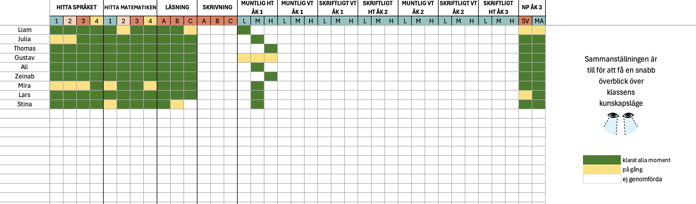 Detta är möjligt med en excelfil som erbjuder dig som lärare, samt skolans elevhälsoteam ett enklare sätt att överblicka elevernas kunskaper. Du slipper använda skolverkets mallar, får en snabb överblick över din klass och kan spara information digitalt. Använd materialet när ni har avstämningar, på EHM eller vid resultatanalyser. Du kan även göra en enklare sammanställning av de nationella proven. När eleverna byter stadie och går upp i årskurs fyra kan du skicka med sammanställningen.
