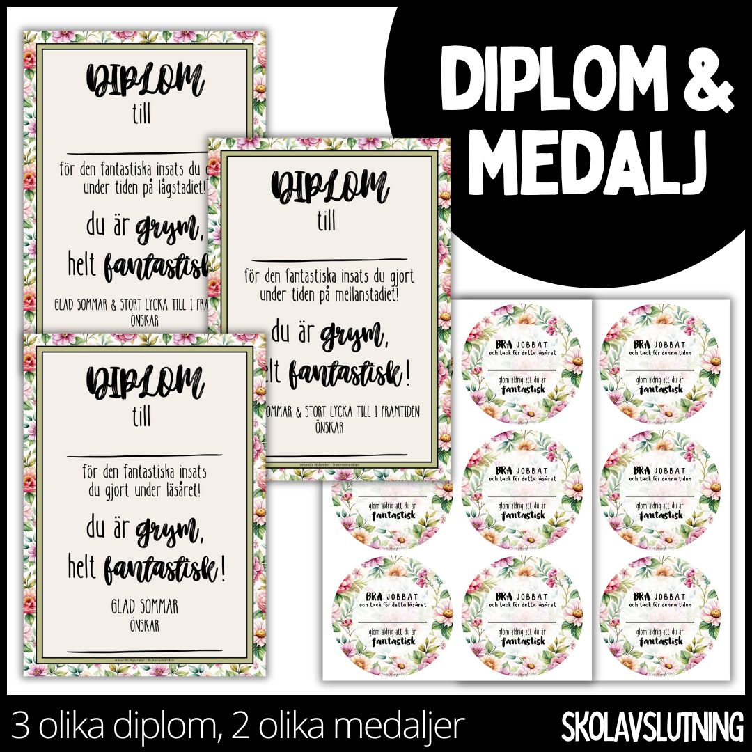 Ett materialpaket med tre olika diplom och två olika medaljer till skolavslutningen. Använd det diplom / den medalj som passar dig bäst. Varje diplom och medalj innehåller en fin hälsning och en dekorativ baksida.