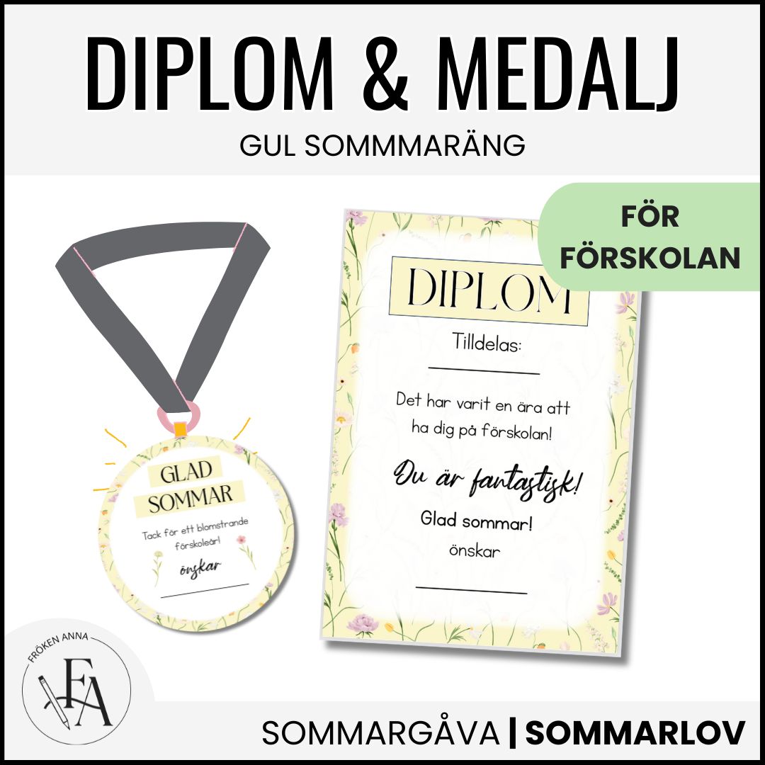 Ge förskolebarnen ett fint avslut med detta somriga diplom och medalj! Perfekt som sommargåva och en uppskattad gest för att uppmärksamma deras utveckling under året.