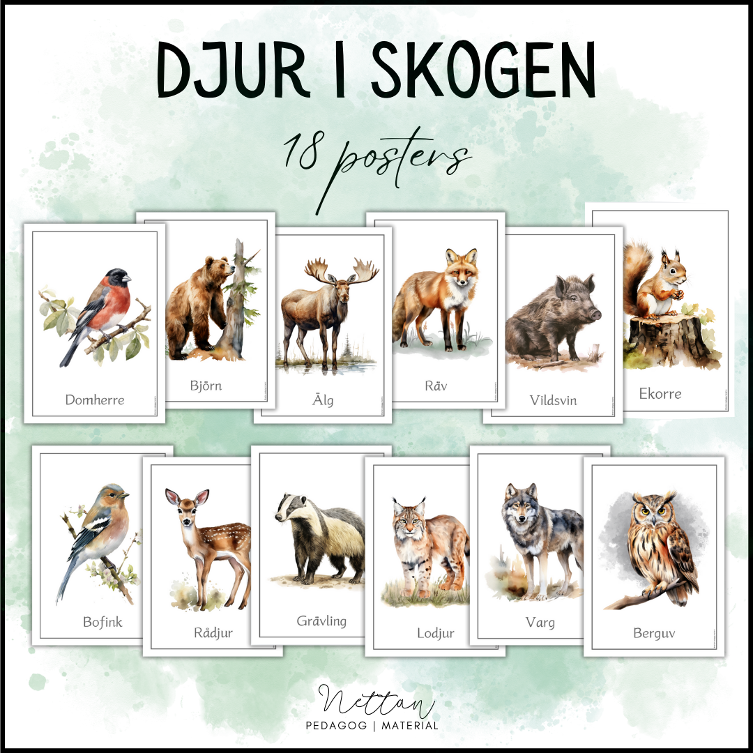 Djur som ingår är björn, älg, räv, varg, lodjur, rådjur, ekorre, hare, igelkott, vildsvin, grävling, groda, snäcka, berguv, hackspett, domherre, bofink, fladdermus.