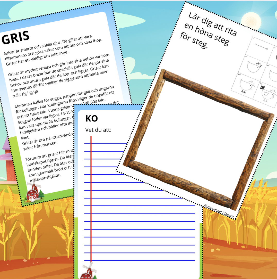 5 fakta texter, en om varje djur; ko, häst, gris, höna och får. Ett ark till varje djur att skriva egna ” Vet du att…” meningar samt lär dig att rita djuren steg för steg.