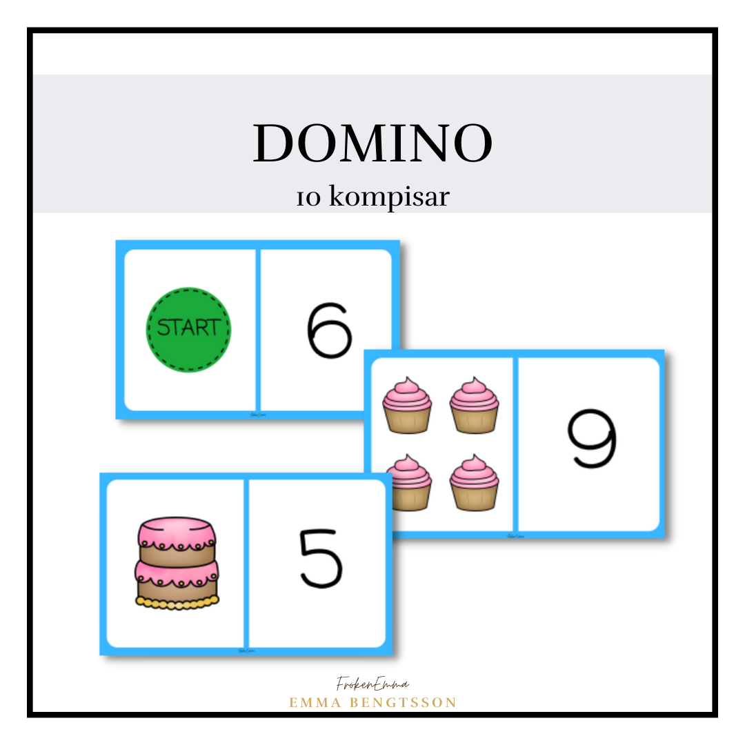 Detta är ett ”domino” där eleverna kan behöva tänka till lite. Här ska eleverna lägga ihop rätt tiokompisar på rad och de behöver tänka på både tal och antal samtidigt. Först lägger eleverna kortet som det står start på. På samma kort står talet 6 som eleverna ska fortsätta på genom att koppla ihop tiokompisen till talet 6. Det gör eleverna genom att koppla ihop talet 4 i representationsformen bild, alltså 4 cupcakes och sedan fortsätter det till stopp. Så det är hela tiden tal med antal, aldrig 2 siffror på raken. Du ser den tänkta ordningen som korten ligger i dokumentet.