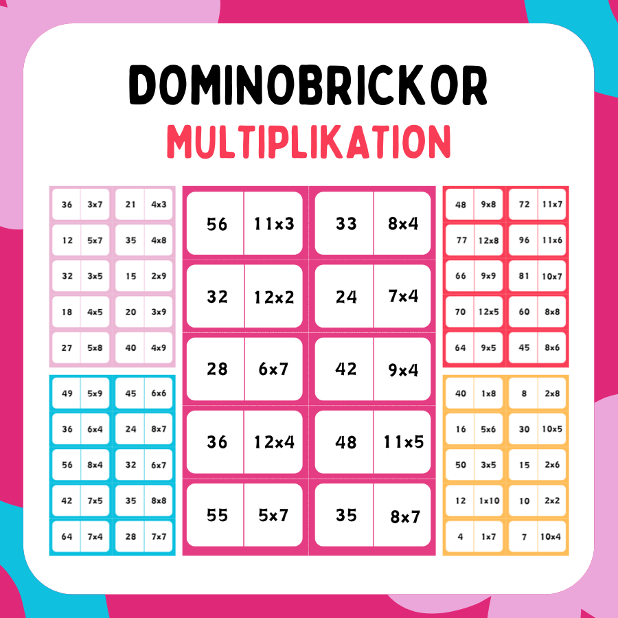 Dominokort med multiplikationer och produkter. 5 ark x 10 kort med varierade svårighetgrader. Fungerar till ”jag har, vem har”, interaktiva matematiklektioner eller roliga startuppgifter. Bäst att laminera och klippa ut.