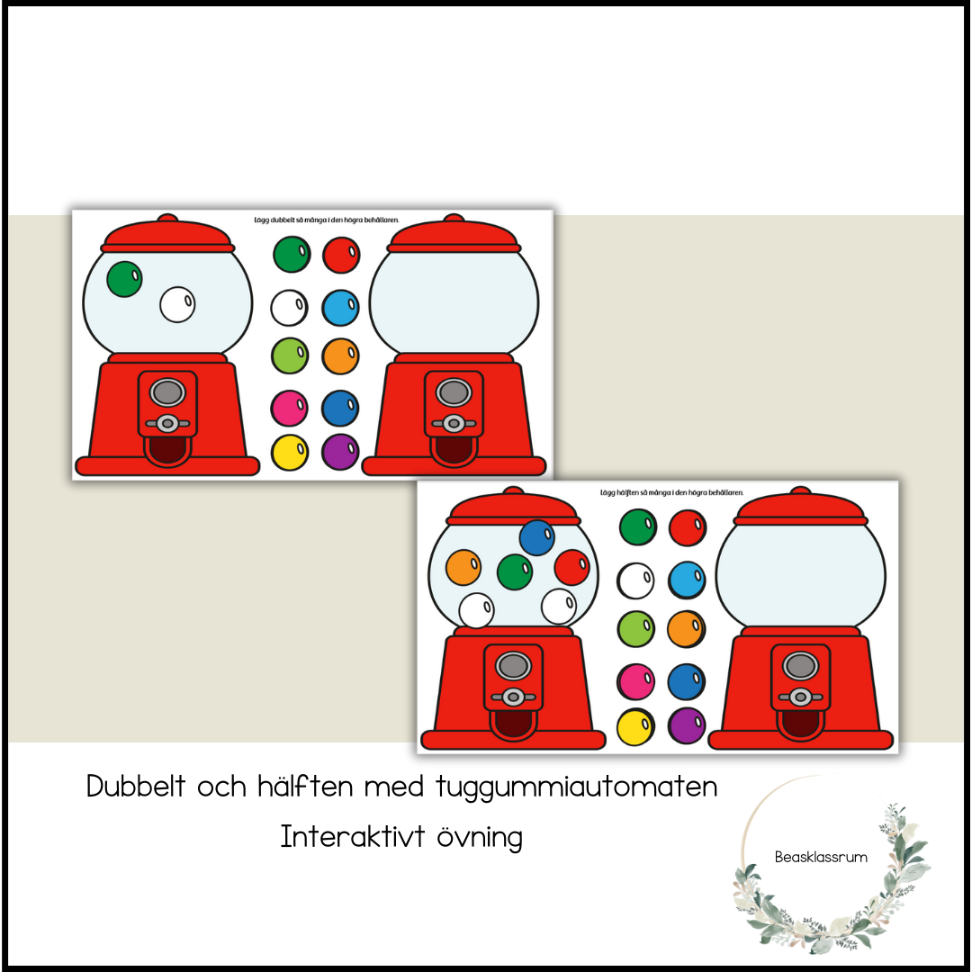 Interaktiv övning där eleverna tränar begreppen dubbelt och hälften genom att placera godis i automaten.