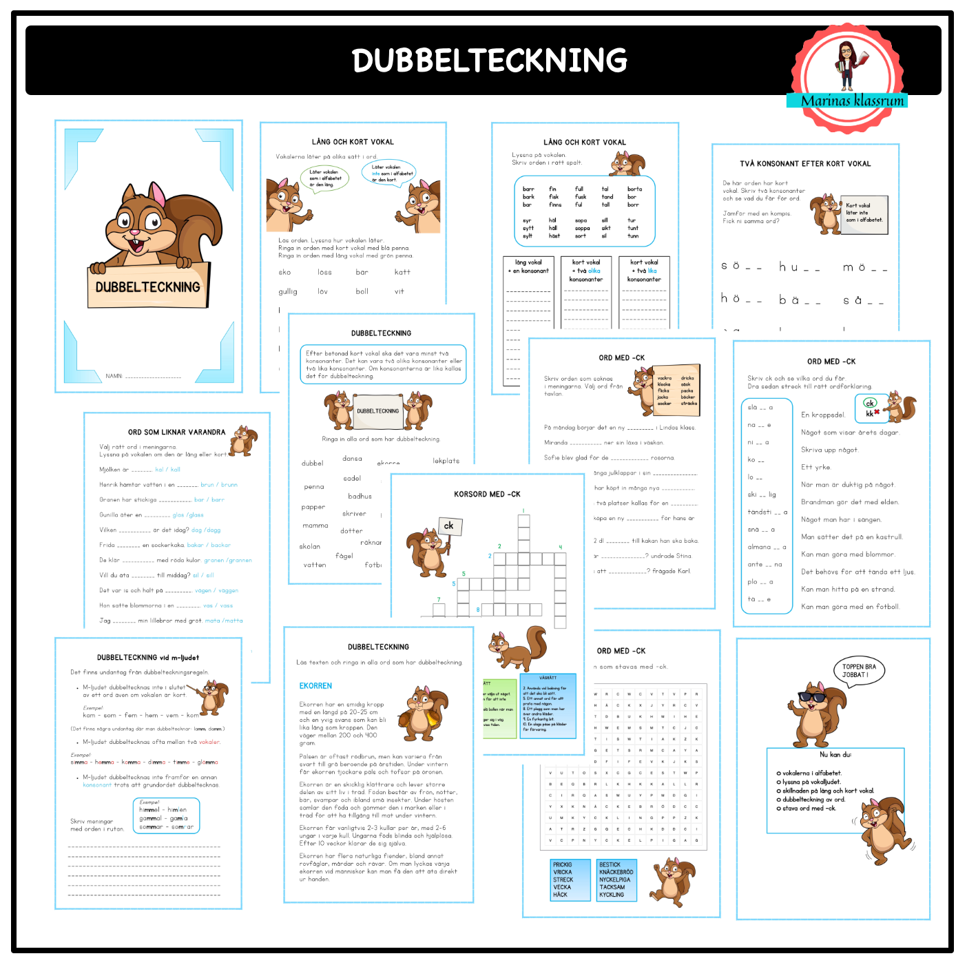 Ett arbetshäfte som tränar dubbelteckning på olika sätt. Med ekorrens hjälp får eleverna lära sig att stava rätt med tydliga förklaringar och faktarutor med regler. Det finns även ett diplom till eleverna när de är klara. Sidorna i arbetshäftet är inte numrerade för att du som lärare ska kunna välja att individualisera och kunna rikta innehållet och plocka ihop övningar i ett eget häfte beroende på årskurs 1-3. Det ingår även ett facit till alla uppgifter, ladda ner en separat fil.