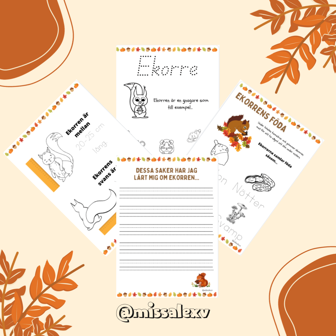 Ett arbetshäfte ( 7 sidor + framsidan) där eleverna får lära sig fakta om ekorrarna. Häftet är väl anpassad till åk 1 och innehållet mycket visuellt stöd. Eleverna får dessutom träna lite på handstilen.