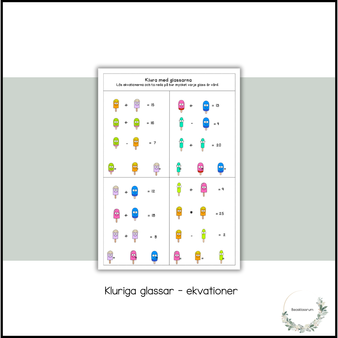 Arbetsblad där eleverna får träna på att lösa ekvationer med glassar.