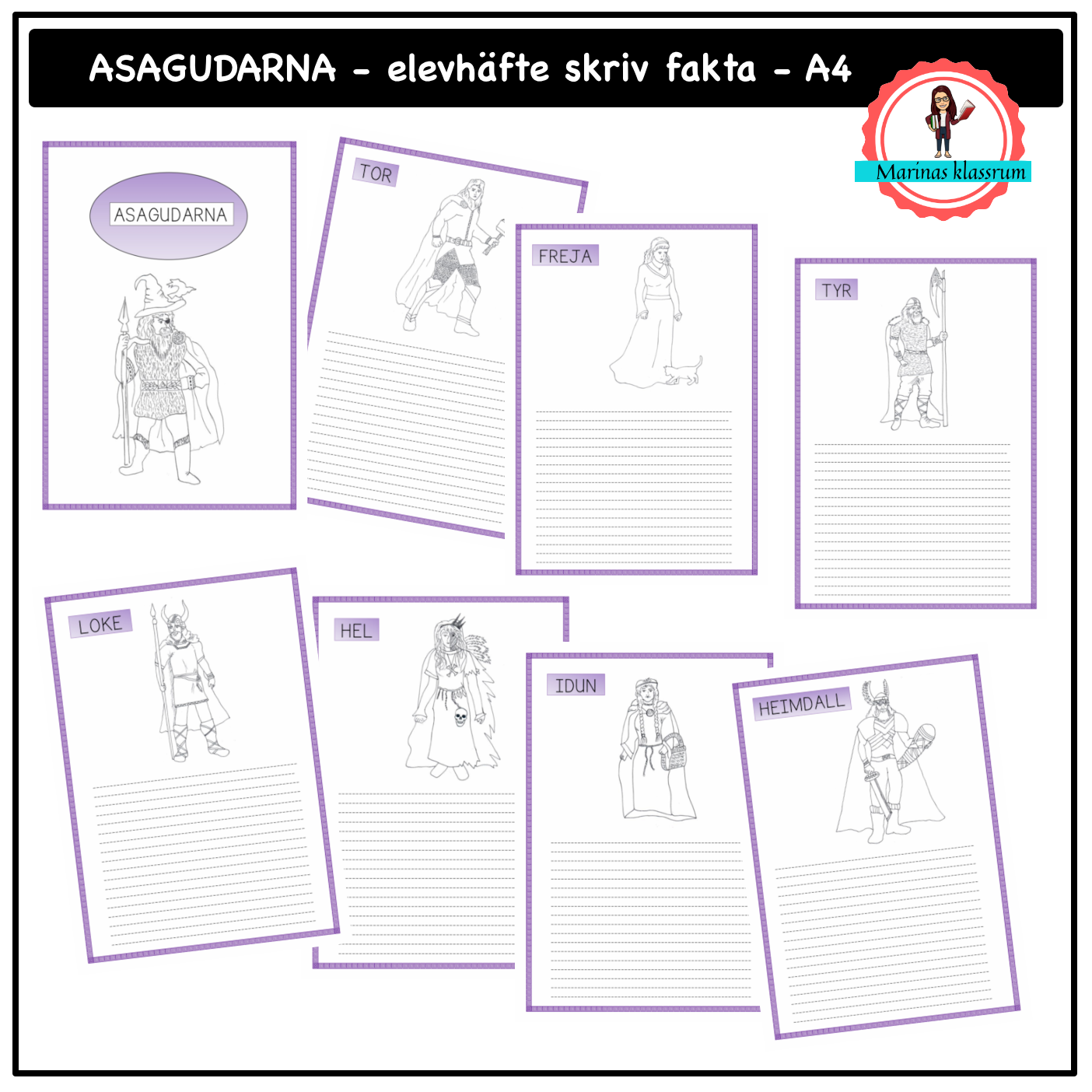 Lär känna asagudarna. Med detta material kan eleverna skriva egen spännande fakta om 11 olika asagudar: Oden, Tor, Frej, Freja, Frigg, Tyr, Balder, Loke, Hel, Balder och Heimdall. Du kan individualisera genom att kopiera upp de gudar som eleven vill arbeta med, några eller många. Det är svartvita bilder så att eleverna själva kan färglägga.